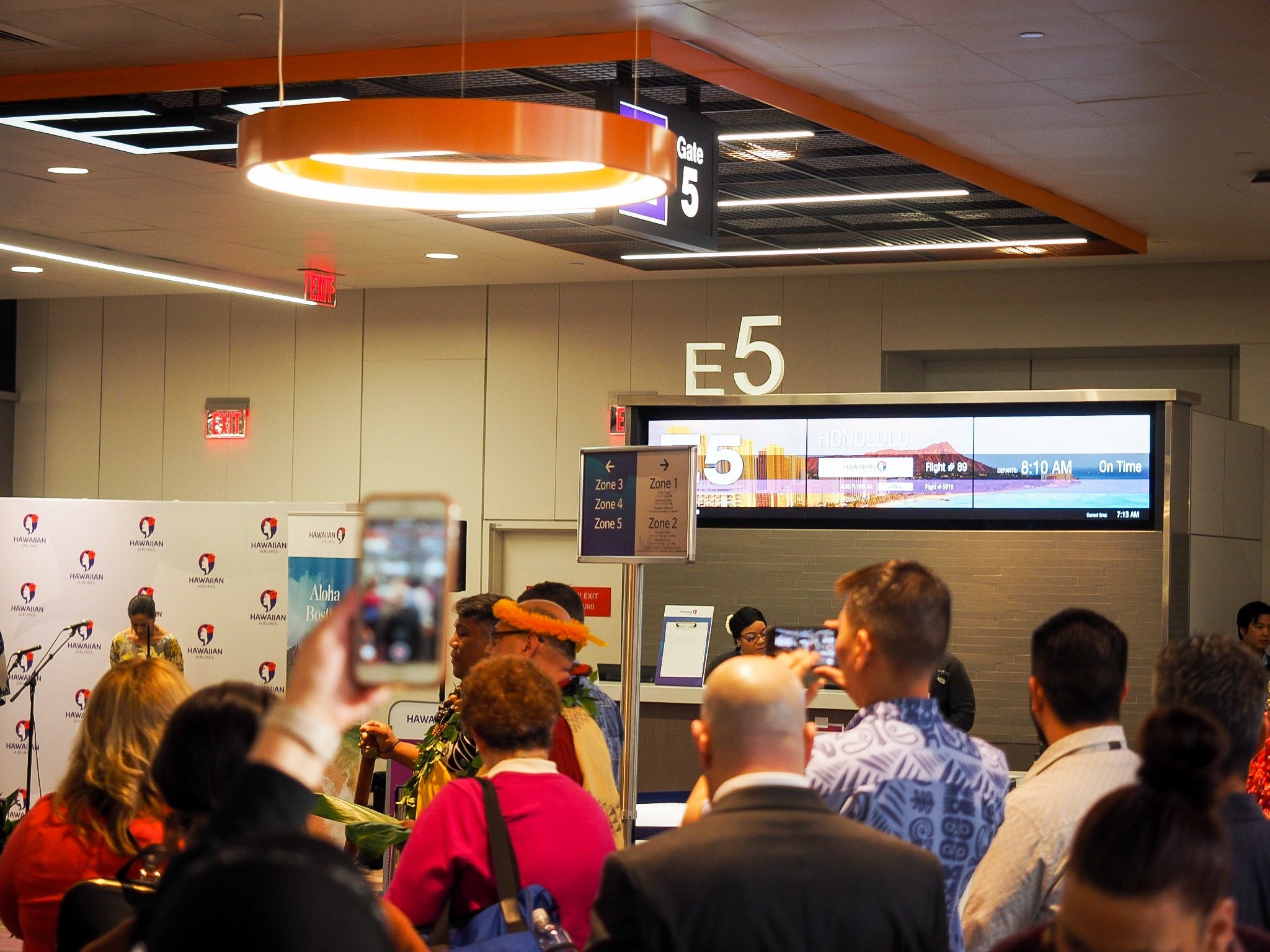 After grabbing some fruit and snapping photos of the ceremony, I listened as the gate agents announced that the flight would be boarding early, at 7:15am. Being in Boarding Group 1, I made my way to the boarding queue, where airline employees were handing out leis.