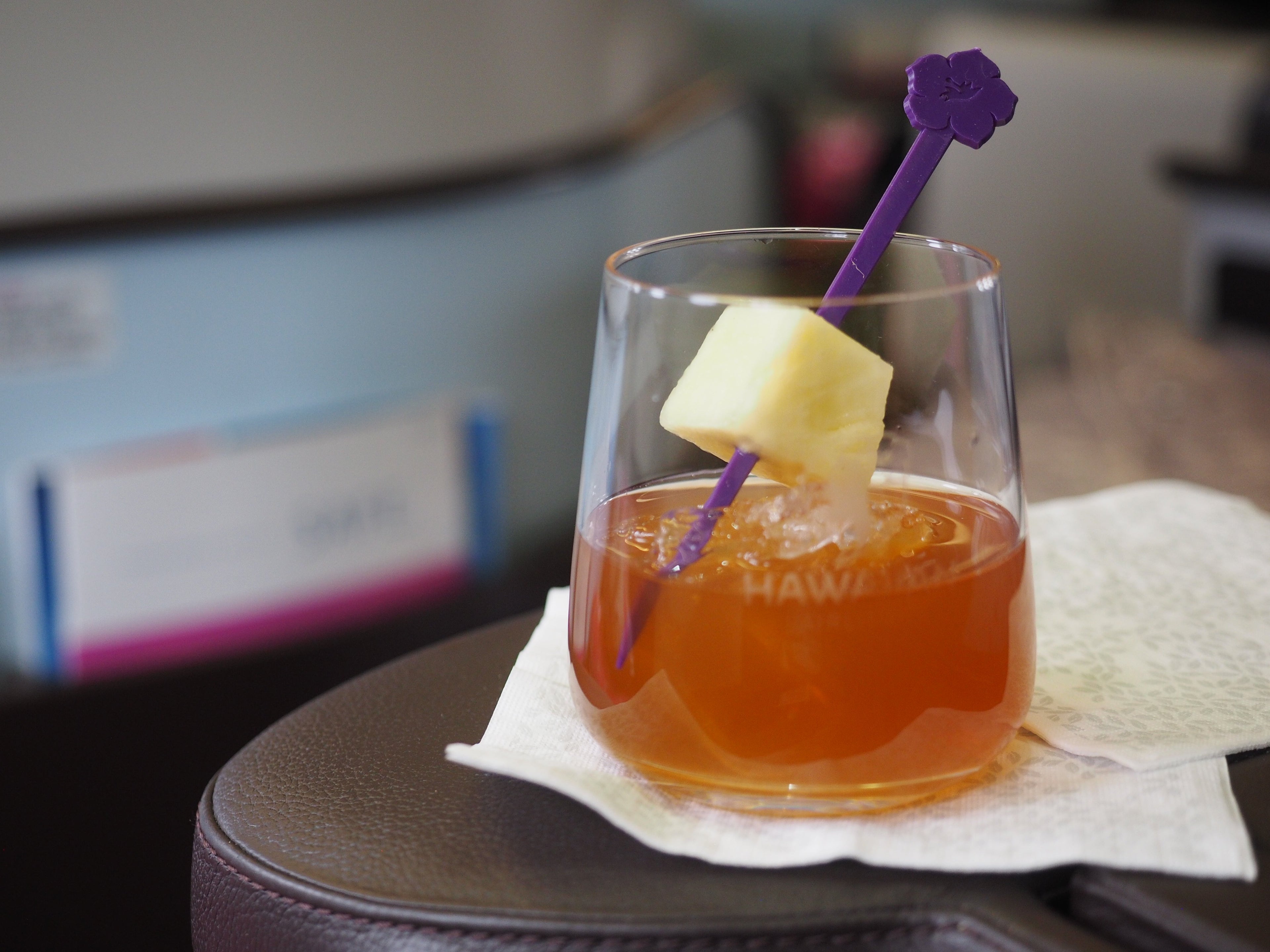 Right after taking my seat after boarding, the flight attendants came around, introduced themselves and handed out a choice of beverages: mai tais, prosecco, water or juice. Even though it wasn't even 8am, I couldn't refuse a mai tai, which came in a real glass.