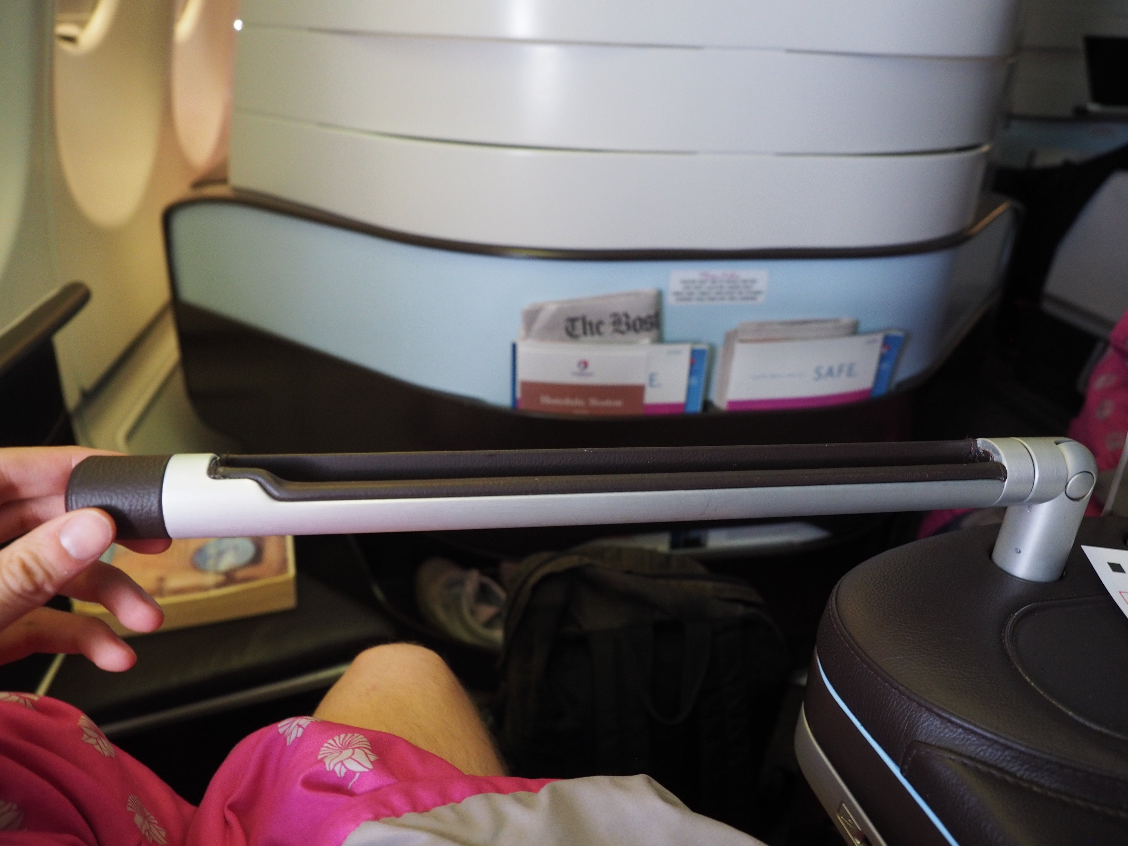 Hawaiian also added a rather clever design feature to the seat that made a big difference in the 2-2-2 configuration. A small space between the ottoman in front of the seat allowed window-seat passengers to pass by anyone seated on the aisle without having to step over them (which typically means straddling them, especially in lie-flat mode). This proved to be hugely helpful in my trips to the bathroom and overhead bins.