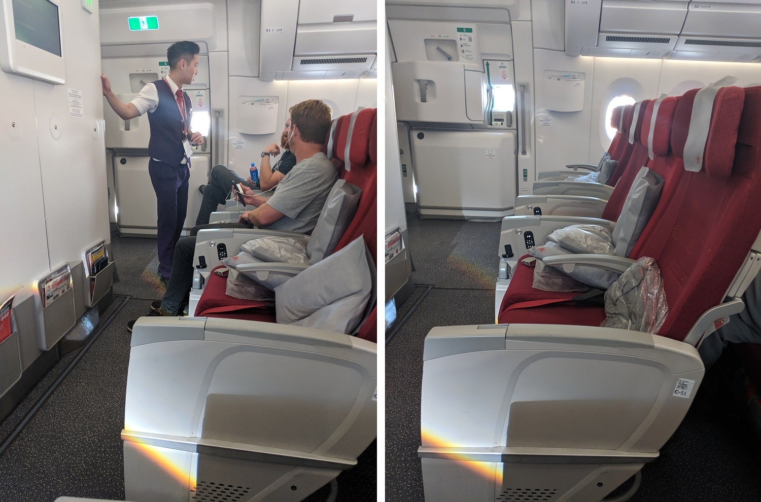 It turns out I was the only one on my flight who paid the extra $109 for an extra-legroom seat in back cabin (seats 52A, 51B to H, and 52K). Squatters quickly scrambled to take these seats during boarding, but they didn't get to enjoy them for long. Before we pushed back, flight attendants told the squatters to return to their seats or pay for their self-upgrade.
