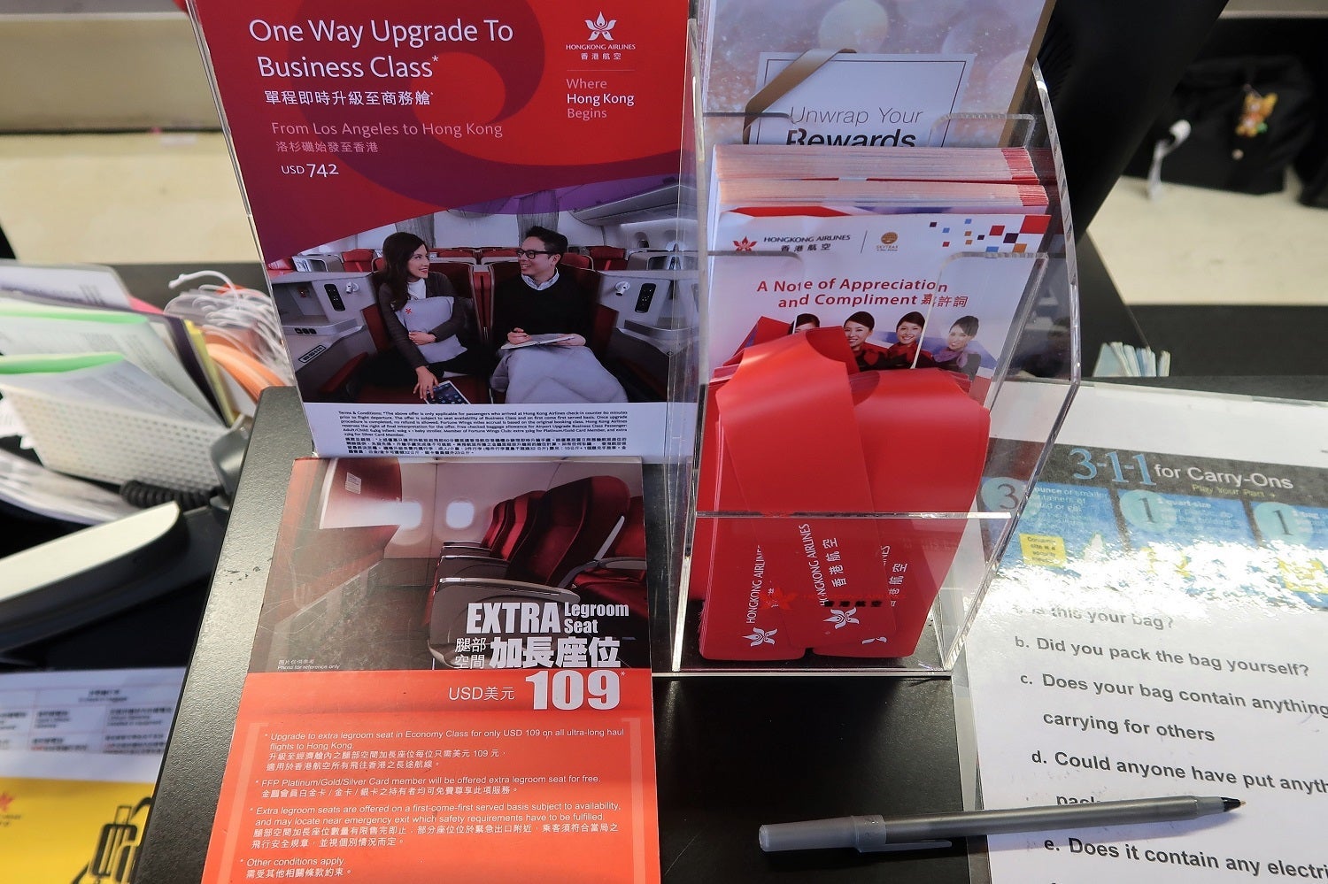 At the check-in counter, you could opt to upgrade to business class for $742 one-way, which the agent described as a limited-time offer. Or passengers could purchase an extra-legroom seat for $109. Platinum, Gold and Silver card members could choose an extra-legroom seat for free.