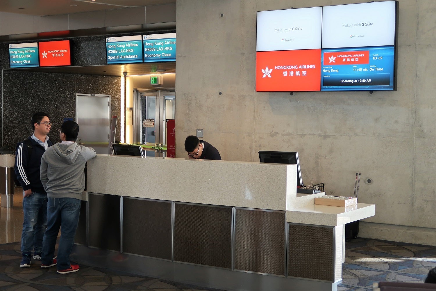 For the sake of the review, I made sure to get to Gate 157 well before boarding time. With no line at the gate counter, I stopped by to inquire again about the cost to upgrade. On the night before my flight, I'd noticed that Hong Kong Airlines was showing zero seats for sale in economy, so I was curious if the upgrade price would decrease to avoid an oversell situation. The gate agent said they weren't able to take payment at the gate, so they weren't able to sell upgrades. Since I was at the counter anyway and I save my boarding passes, I asked for and received a new boarding pass. (My hunch was correct: At boarding, agents tore and retained part of the boarding pass.)