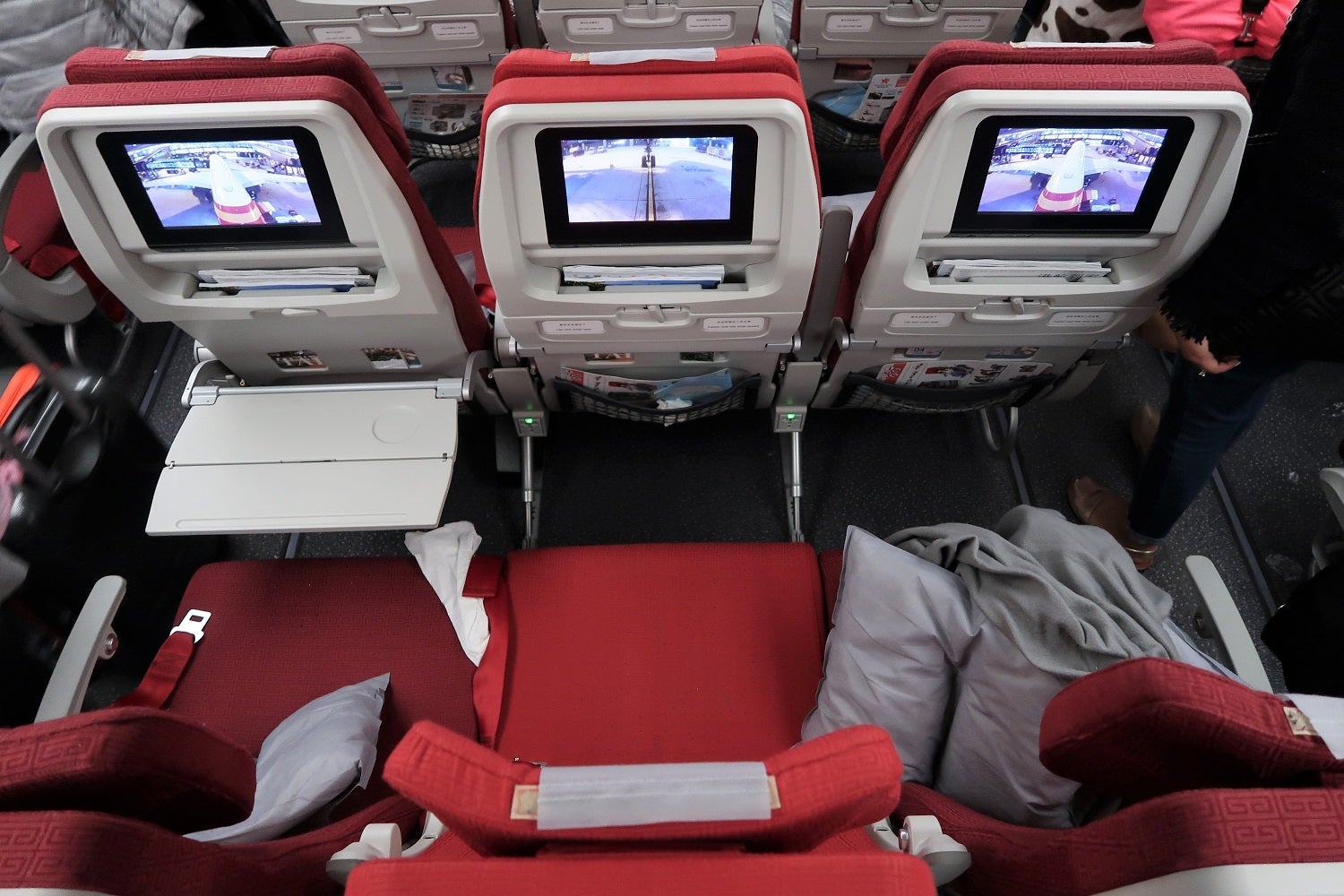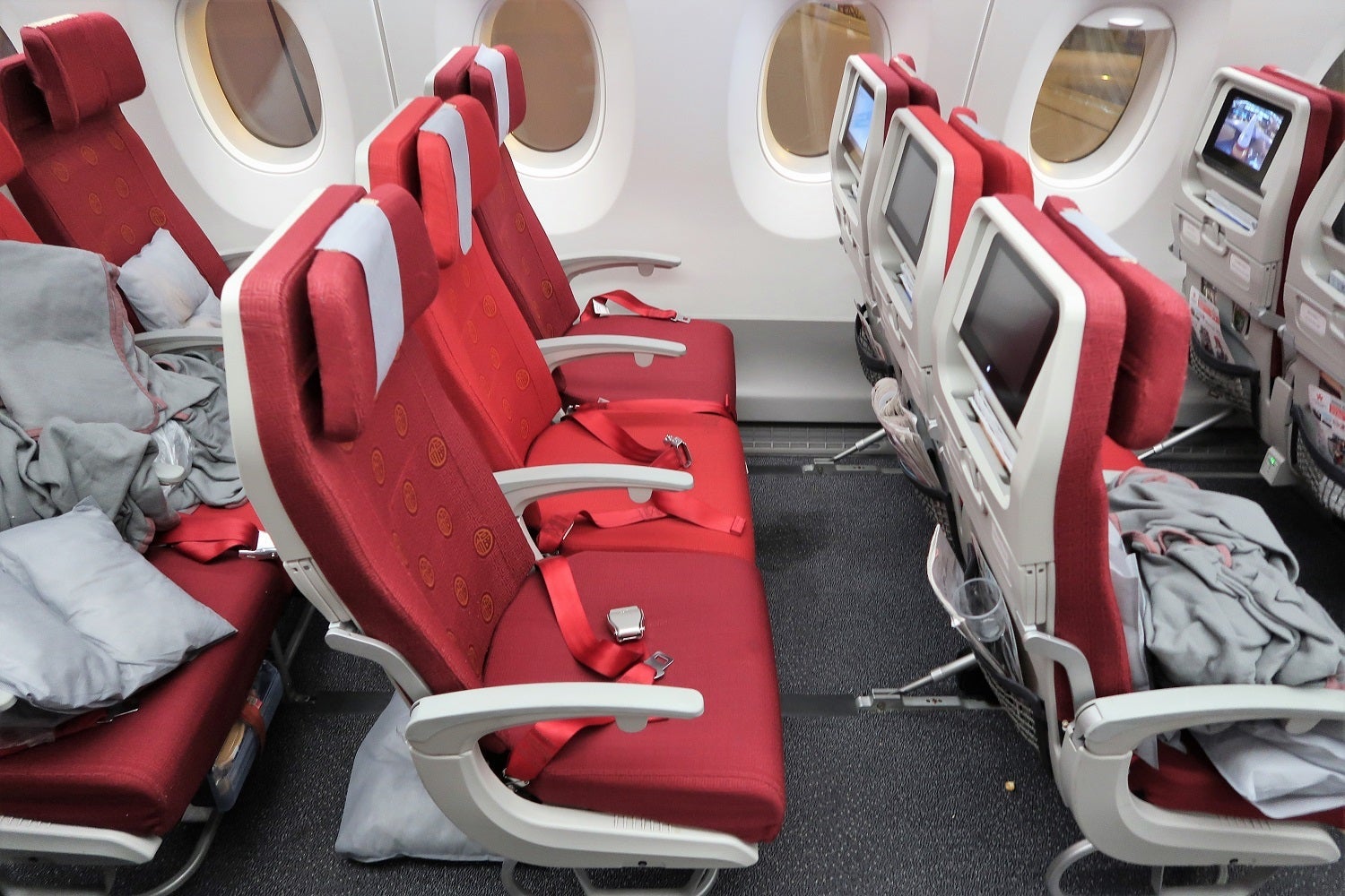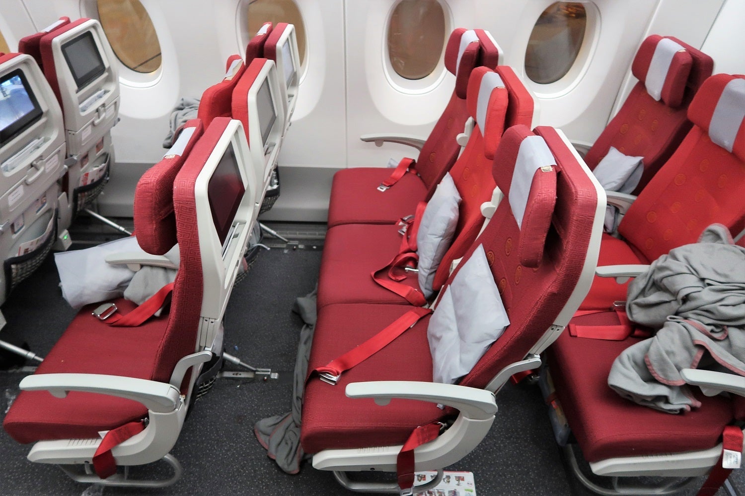 Economy class was split across two large cabins of almost completely 3-3-3 seating. (Most of the photos are from after the flight because the passport situation at boarding.)