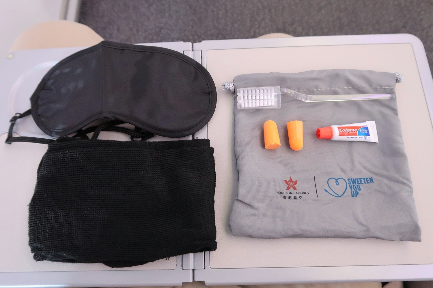 After boarding completed but before pushback, flight attendants passed through to hand out plastic-wrapped earbuds and plastic-wrapped amenity bags. The drawstring amenity bag contained an eye mask, socks, earplugs, a toothbrush and toothpaste.