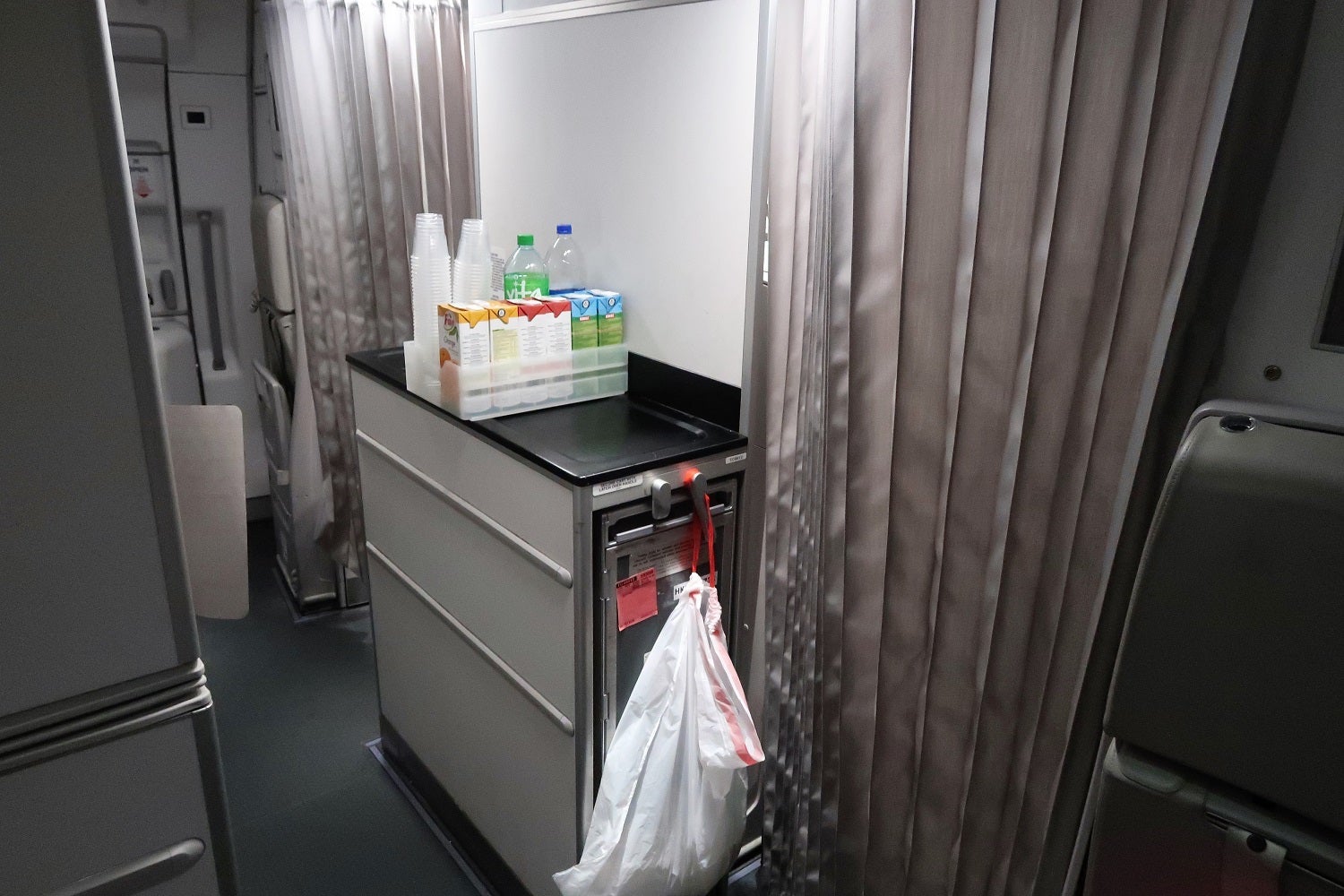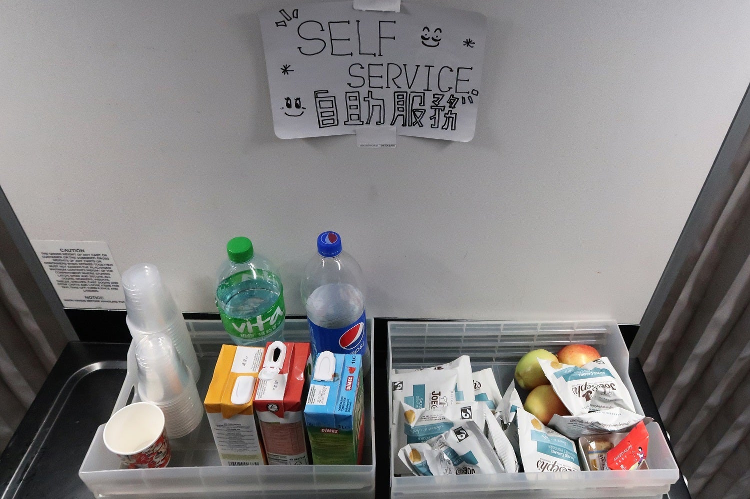 Between meals, there was a self-service drink and snack bar in the back galley, unguarded by flight attendants who were hanging out behind the closed curtain. As I stretched in the back galley, I observed multiple passengers greedily filling bags with these snacks, meaning the basket seemed to frequently run out. These snacks would be the only food available for more than 10 hours of the flight.