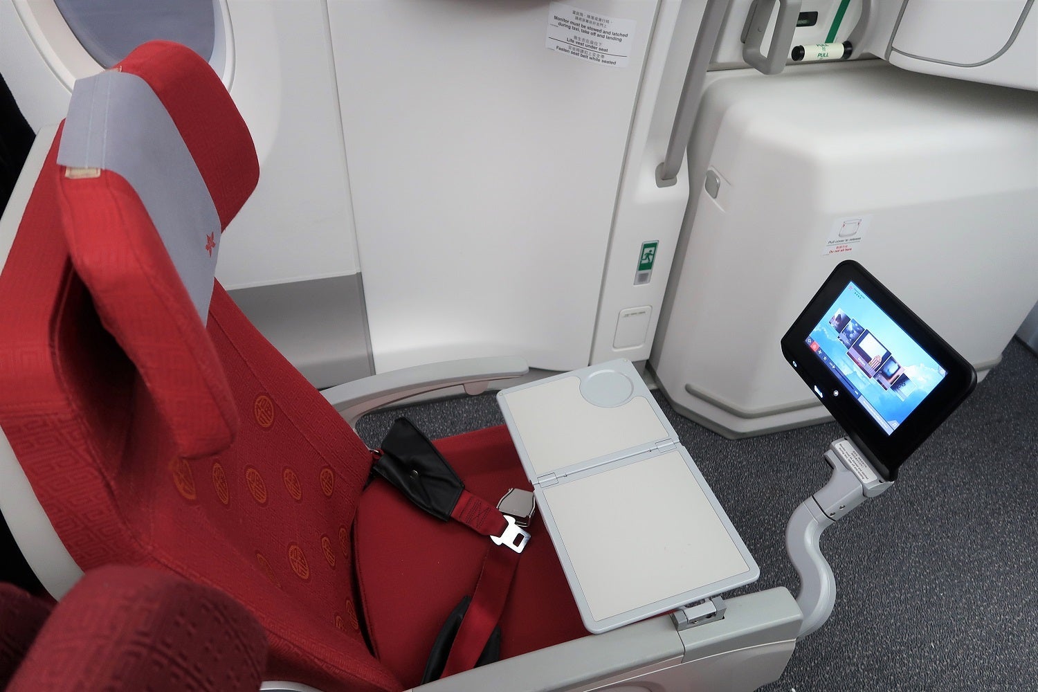 The emergency-exit row and bulkhead seats had an IFE screen that extended from the seat on an arm. These screens had to be stowed for taxi, takeoff and landing, meaning that these passengers couldn't enjoy the aircraft's tail- and downward-facing cameras during these critical phases of flight.