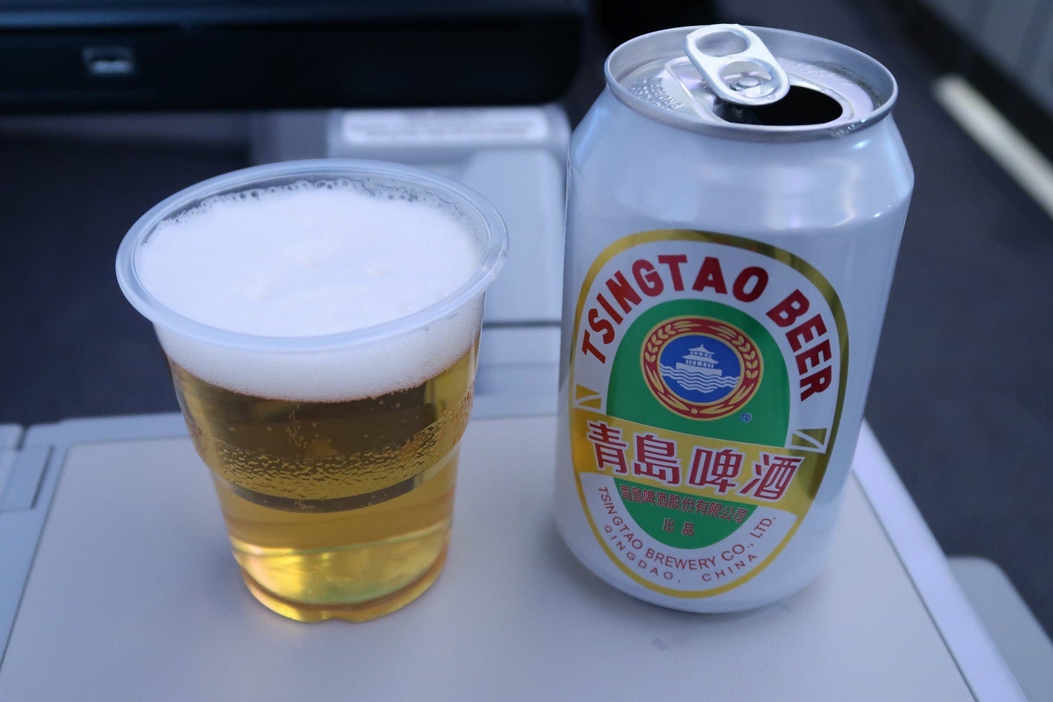 Shortly after takeoff, flight attendants passed through the cabin to hand out bags of mixed nuts as other flight attendants began a first drink service. Carts began at the front of the front cabin and the back of the back cabin, meaning those of us in the middle would be the last to be served. Drink choices included juices, sodas and two types of beers. I opted for the Tsingtao.