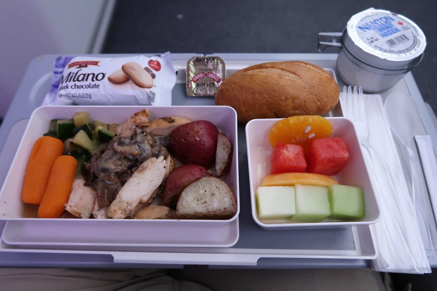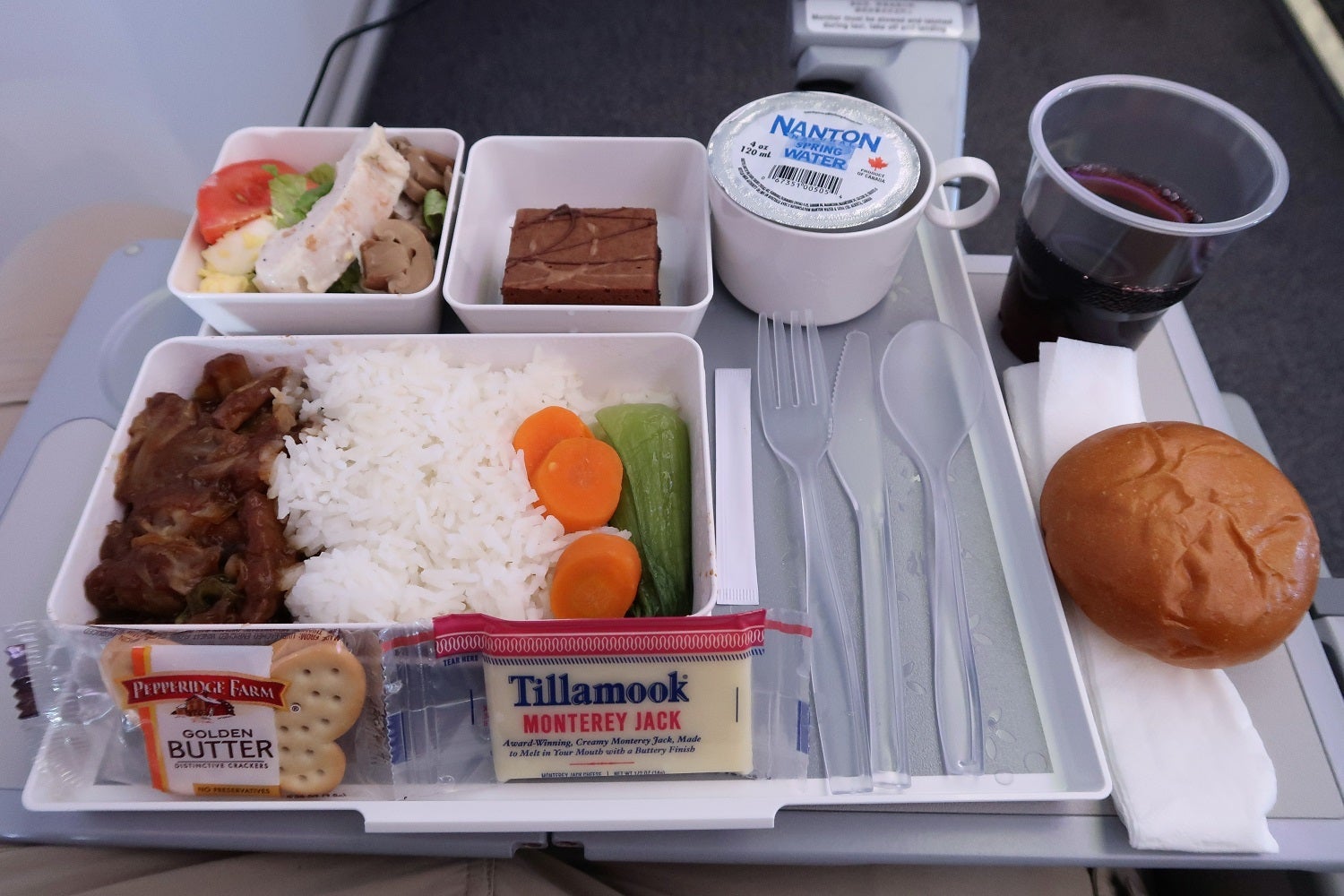 A few hours before landing, flight attendants served the second meal, chicken with potatoes or beef with rice. I chose the chicken. This one didn't turn out as well as the first meal, with the meat being of lower quality and the potatoes not warming up quite right. That said, it was fine for an economy meal.
