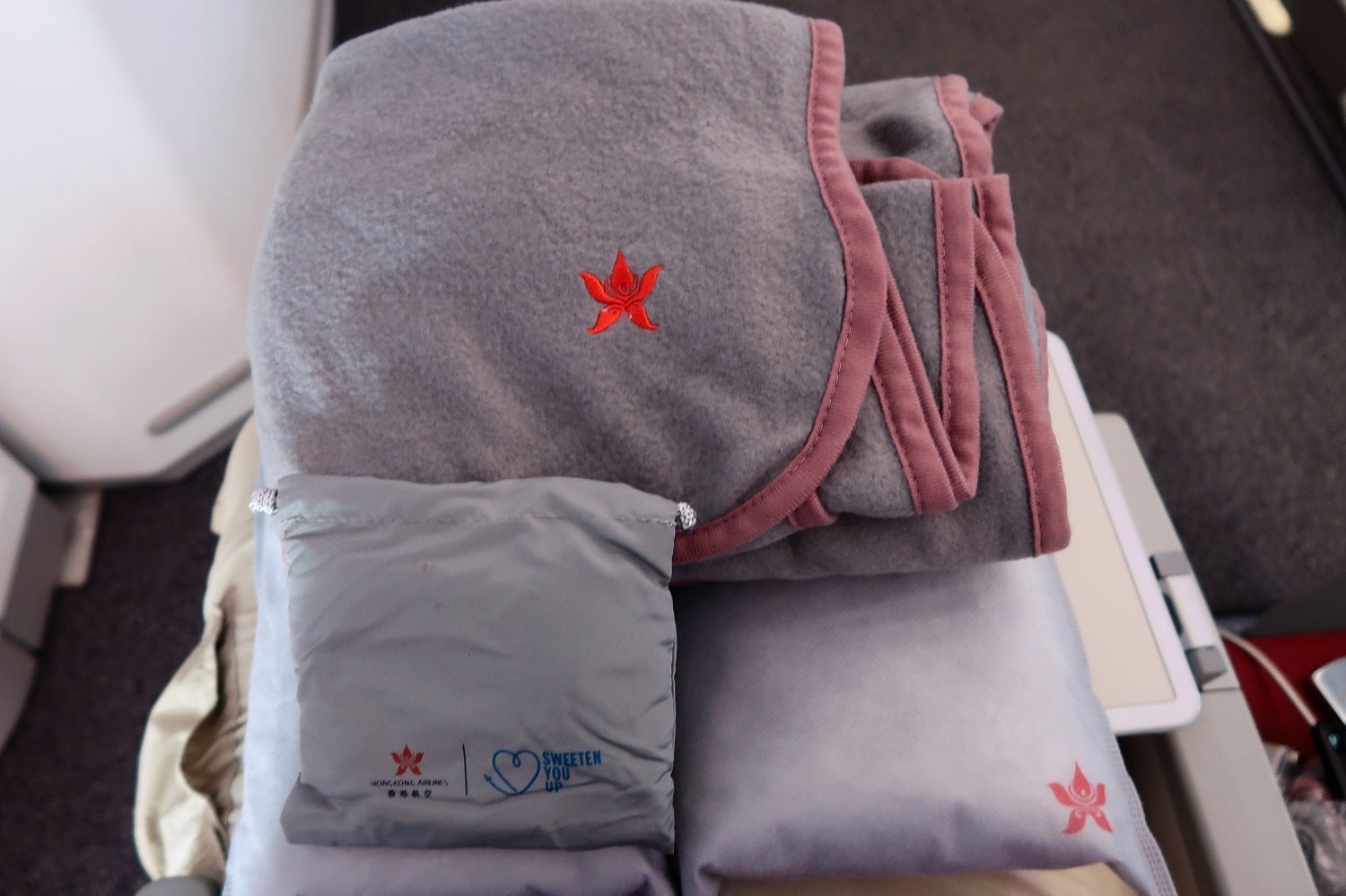 At boarding, each seat was stocked with a plastic-wrapped soft blanket and an unwrapped pillow. The pillowcase was wisely designed with a perforation in the middle, letting passengers transform the standard pillow into a neck pillow. However, I found the pillowcase material to be scratchy after a few minutes around my neck.