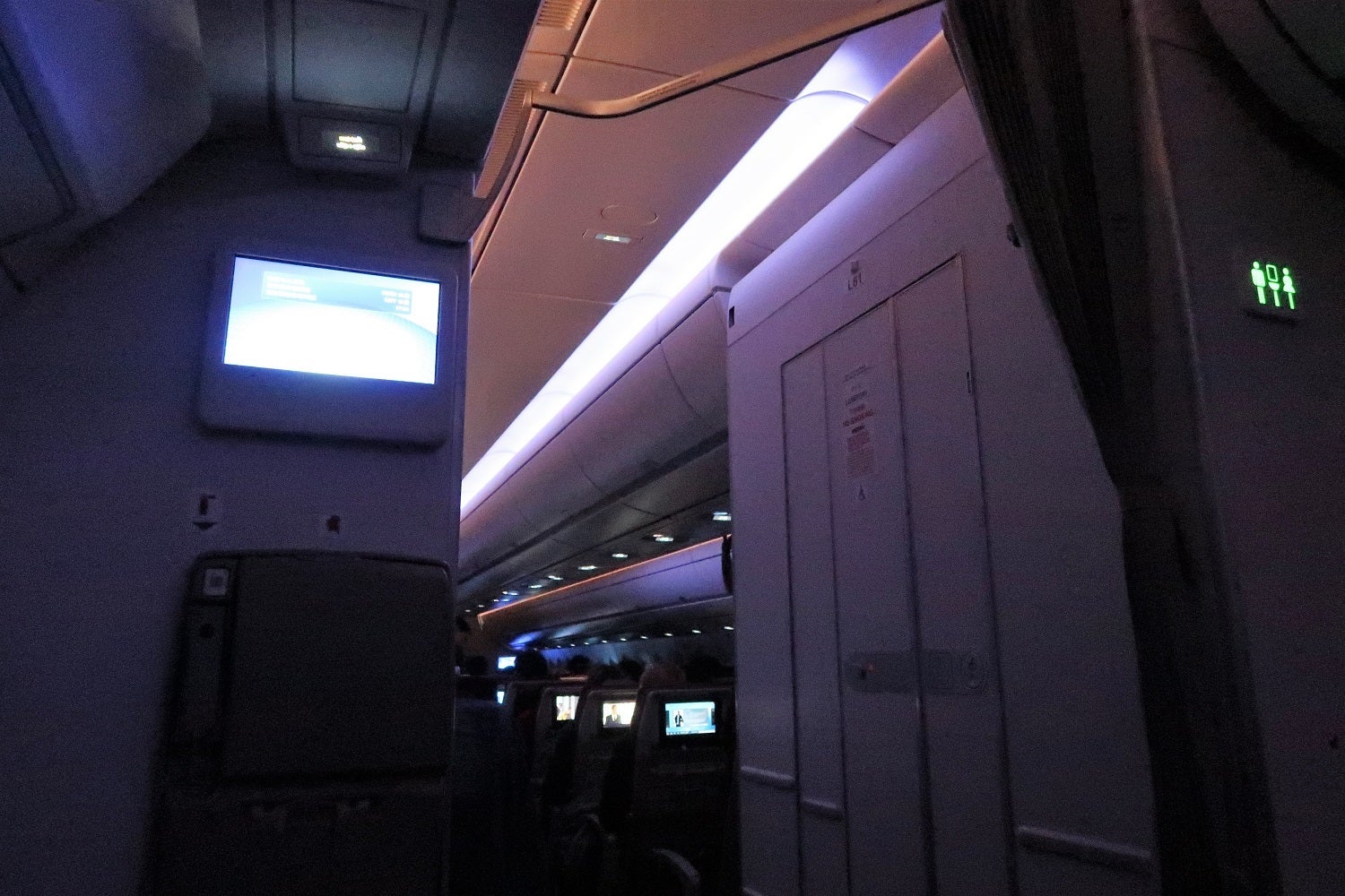 The lights stayed off for most of the flight, with flight attendants gradually turning the lights on for dinner three hours before landing. From there, the lights stayed on through the end of the flight. The cabin was secured 15 minutes prior to landing, and taxiing on the ground only took four minutes. My flight arrived at the gate in Hong Kong at 5:59pm, 36 minutes early.