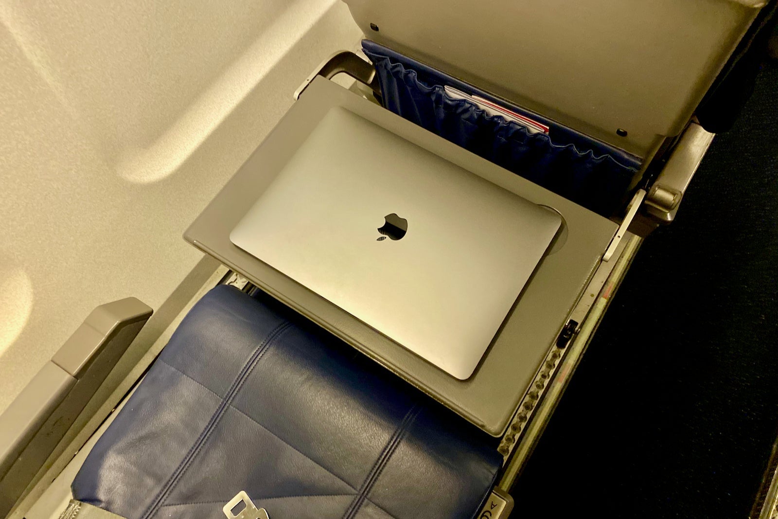 The tray table folds down from the seat in front and measures 16 inches wide and 10.5 inches long — plenty large enough for my 13-inch MacBook Pro.