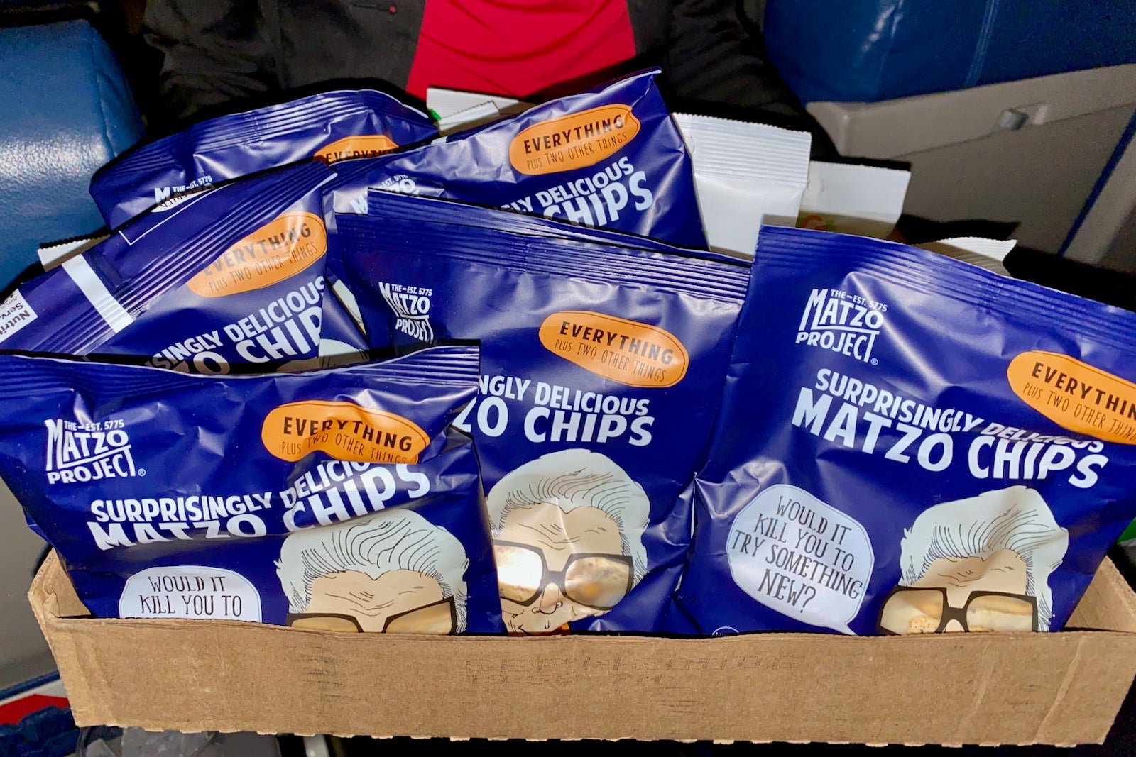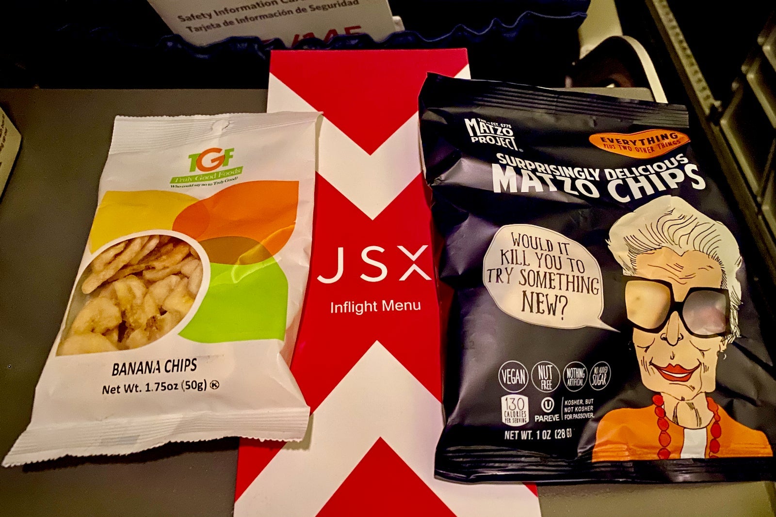 After the drinks, she brought around the snack basket. This wasn't the best snack basket I've seen, but it had a pretty unique selection. There were everything-flavored matzo chips, banana chips and mixed nuts.