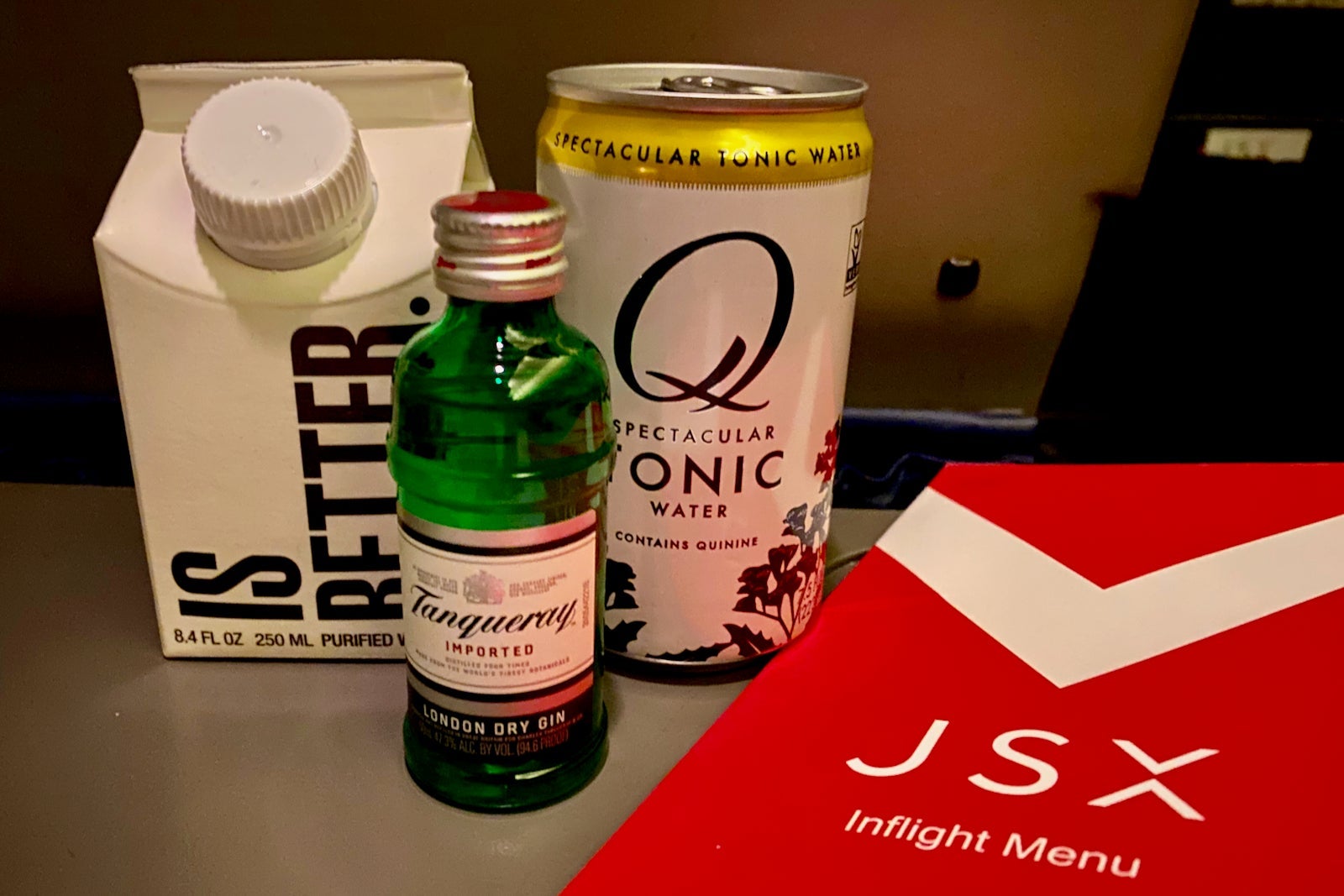 The friendly French flight attendant passed through the cabin while we were still on the ground to collect drink orders. She explained that I could order whatever I wanted. I chose a gin and tonic and asked for some water as well.