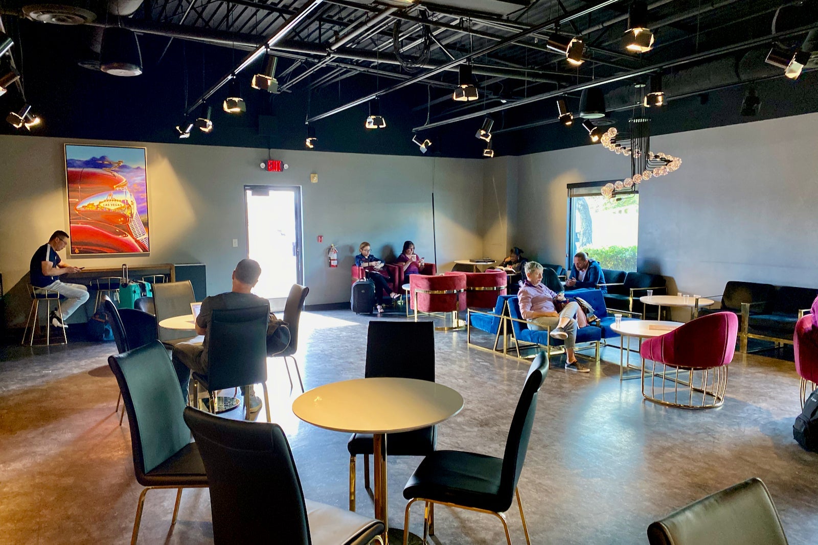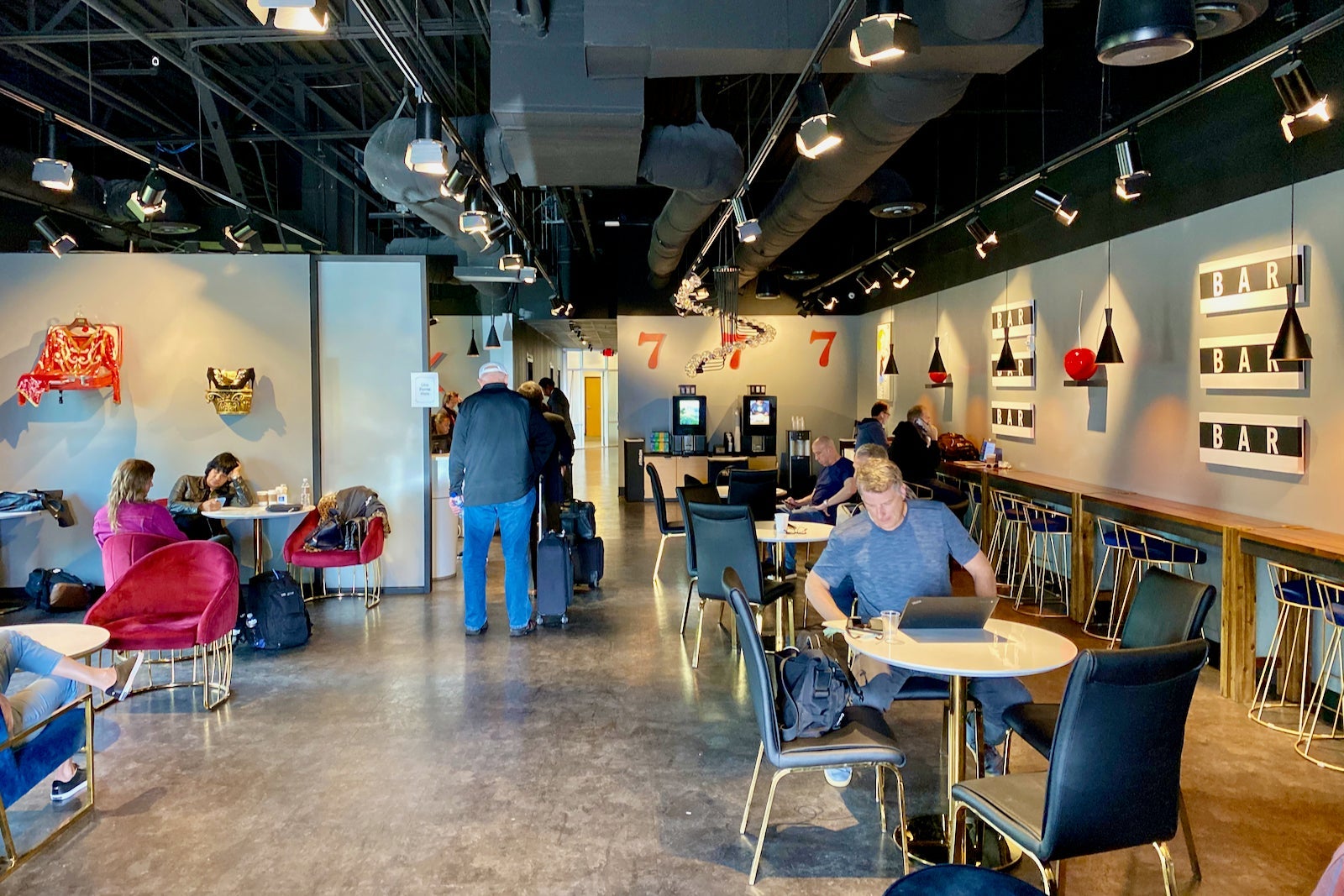 During the delay, I waited in the lounge area. There were a few tables and some countertop seating, with power outlets spread throughout the space. Complimentary Wi-Fi was available and speeds measured 20 Mbps download and upload.