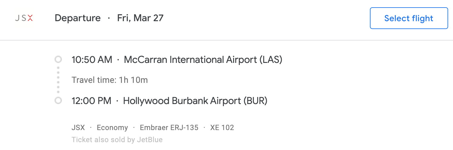 In some ways, JSX isn't a commercial airline, but it behaves like one when it comes to booking a ticket. You'll find the full flight schedule on Google Flights, which will then redirect you to book on JSX.com.
