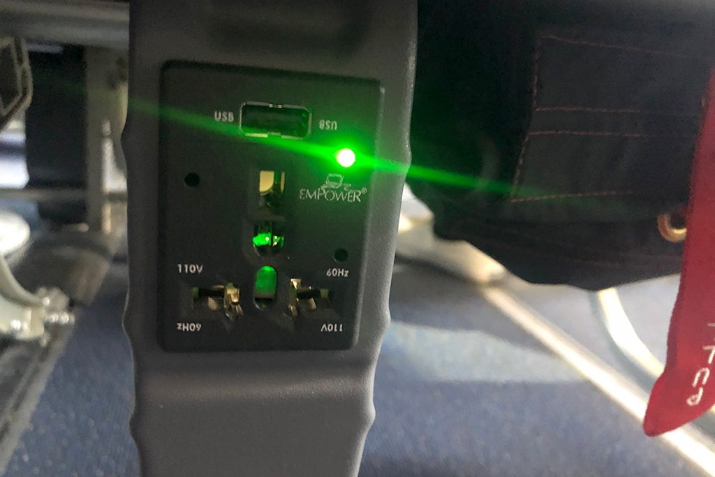 There were power ports between the seats. Please appreciate the contortion that was required of me to get a clear shot of the one by my seat.