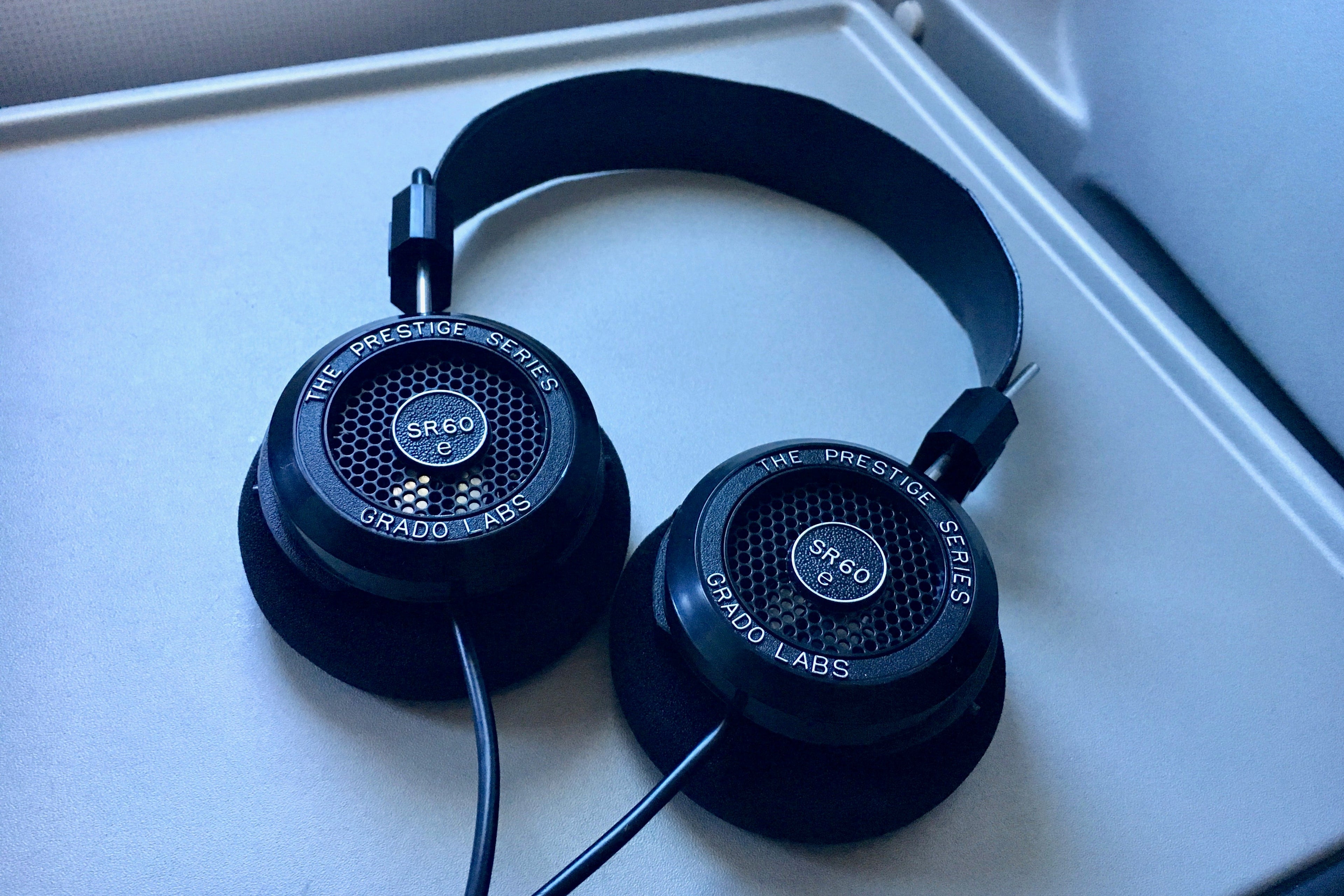 I asked for and was promptly given Grado Labs SR60e Prestige Series headphones. Though not noise-cancelling, like the Bose ones American provides, I found these to be perfectly fine.