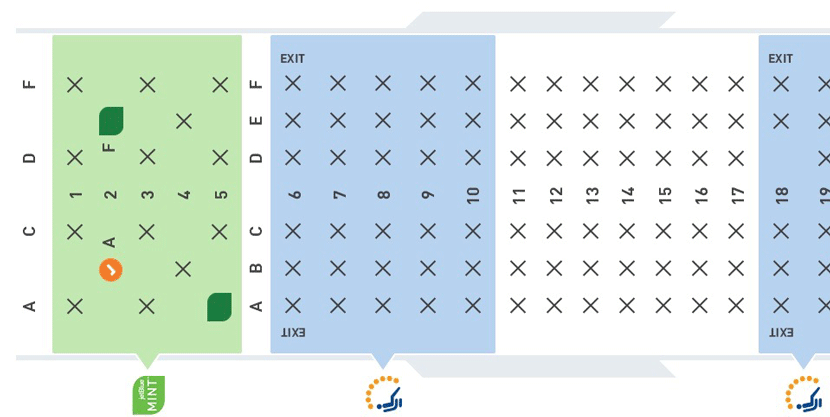 The Mint cabin has a total of five rows, but as previously mentioned, only rows 2 and 4 feature closed-door suites.