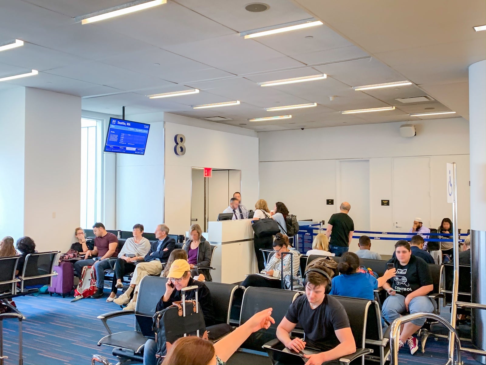 The gate area was jammed, and there weren't any power outlets in sight, so I definitely wouldn't make it a priority to arrive early in advance of a Mint flight.
