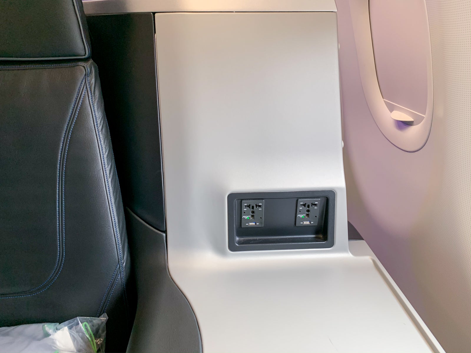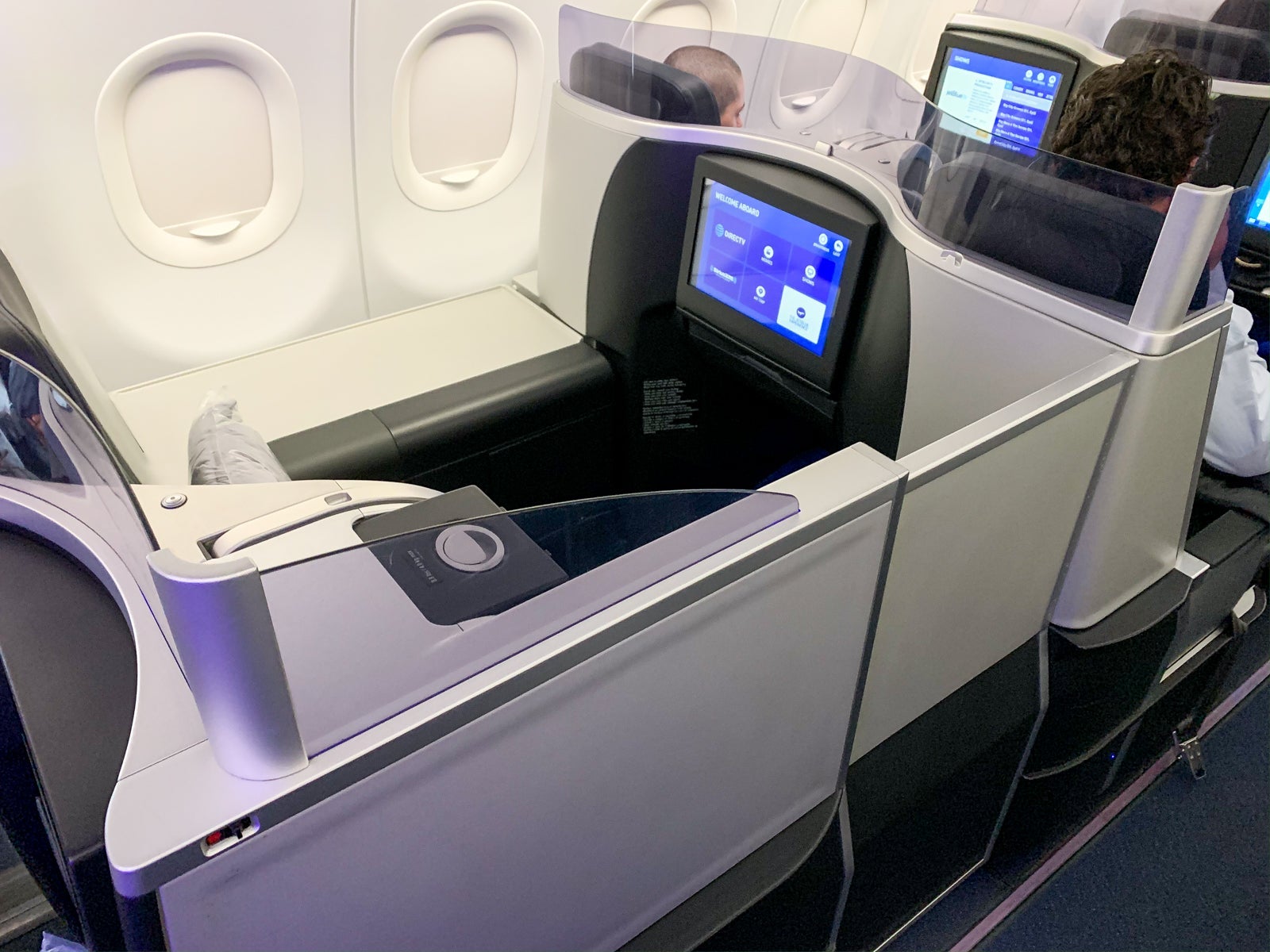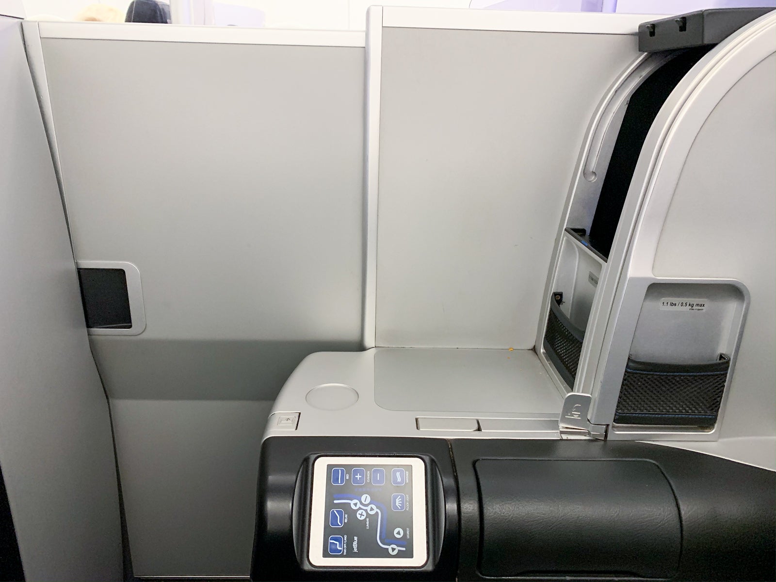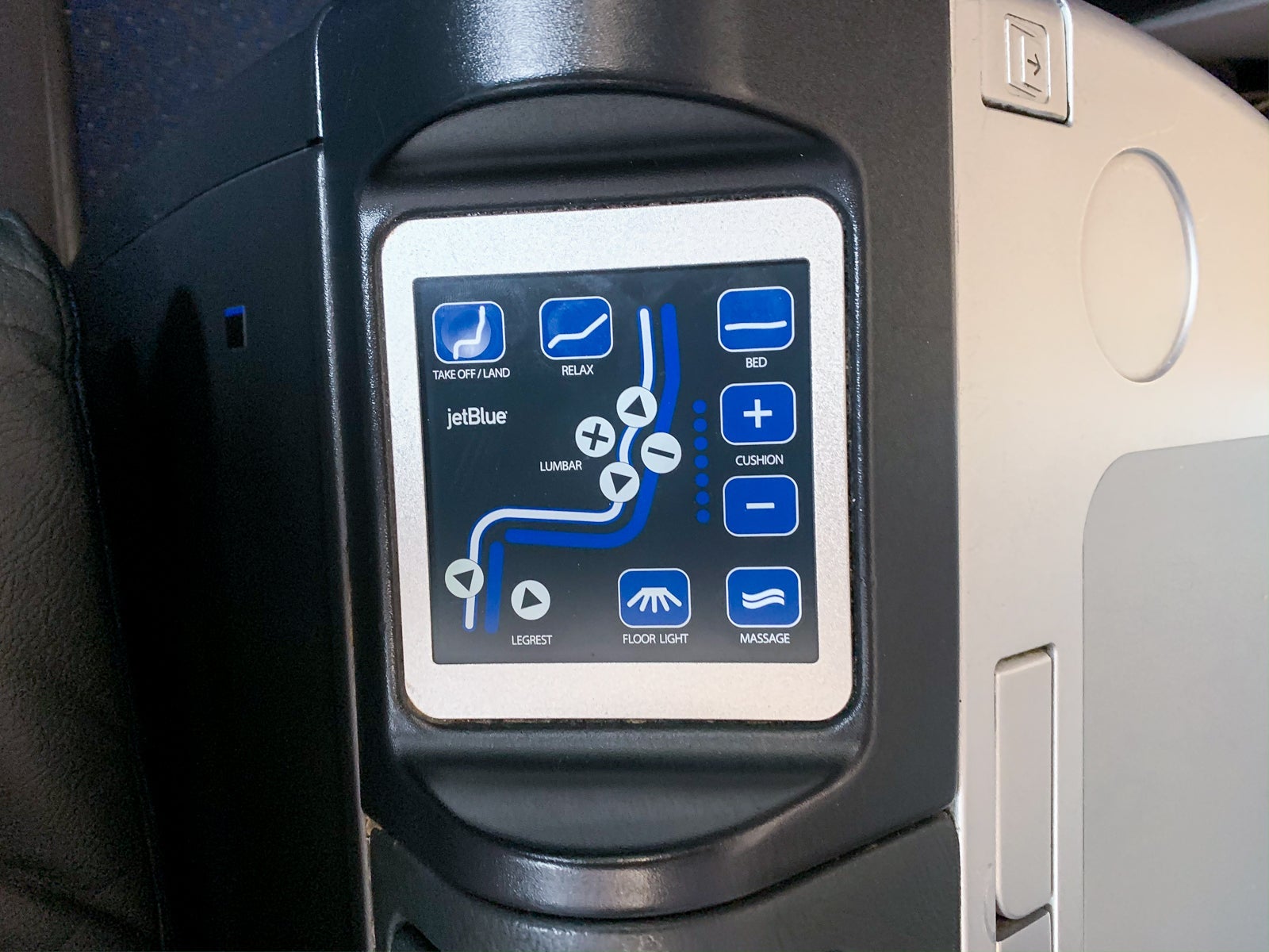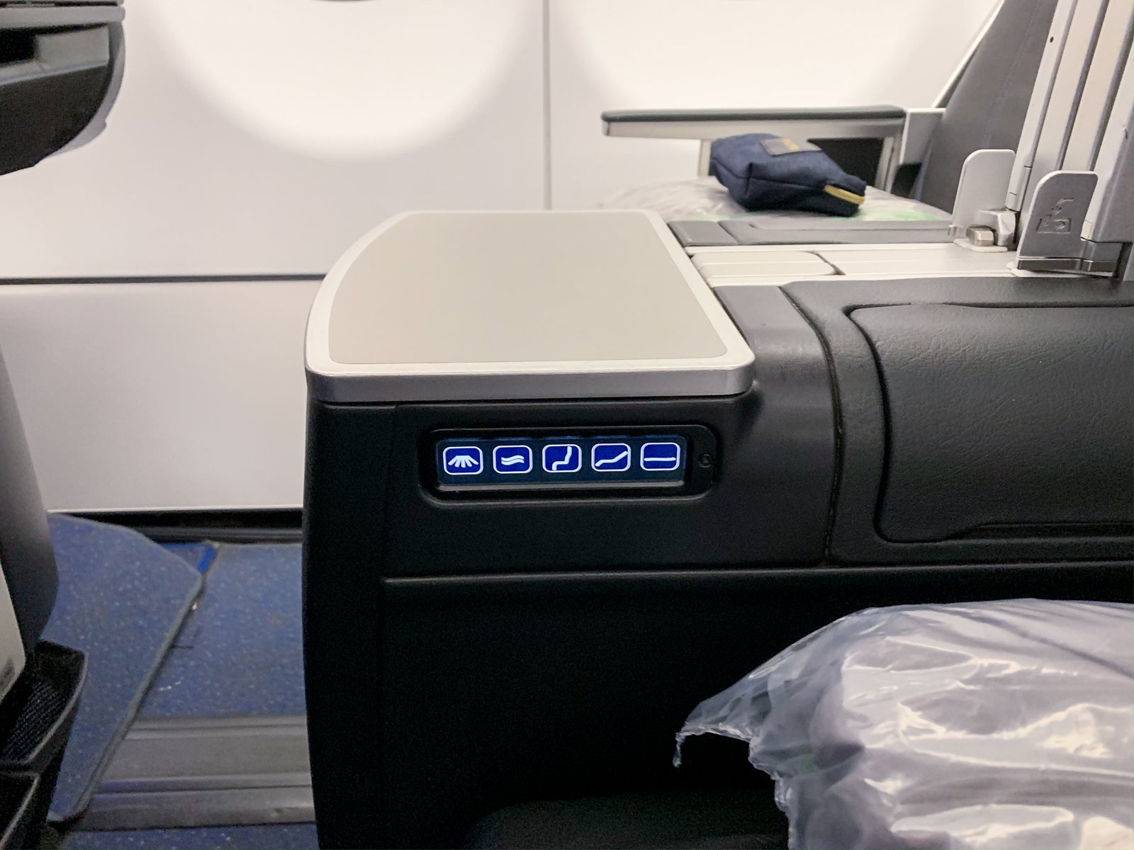 The intuitive seat controls were on the aisle-facing side of the seat. There were a few preset modes like bed and relax, and there were more buttons that allowed you to further customize the cushion firmness and legrest extension. There was a massage mode, as well, which was more of a gimmick than a real feature.