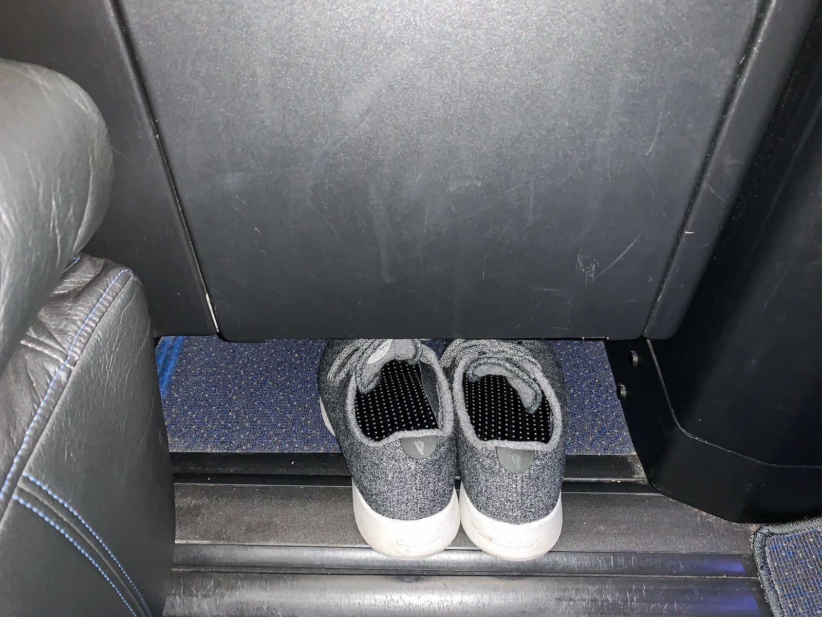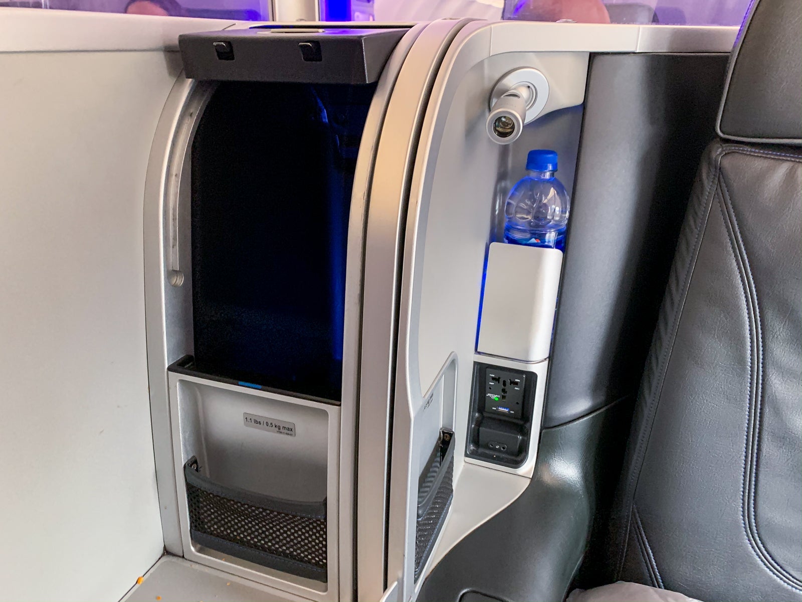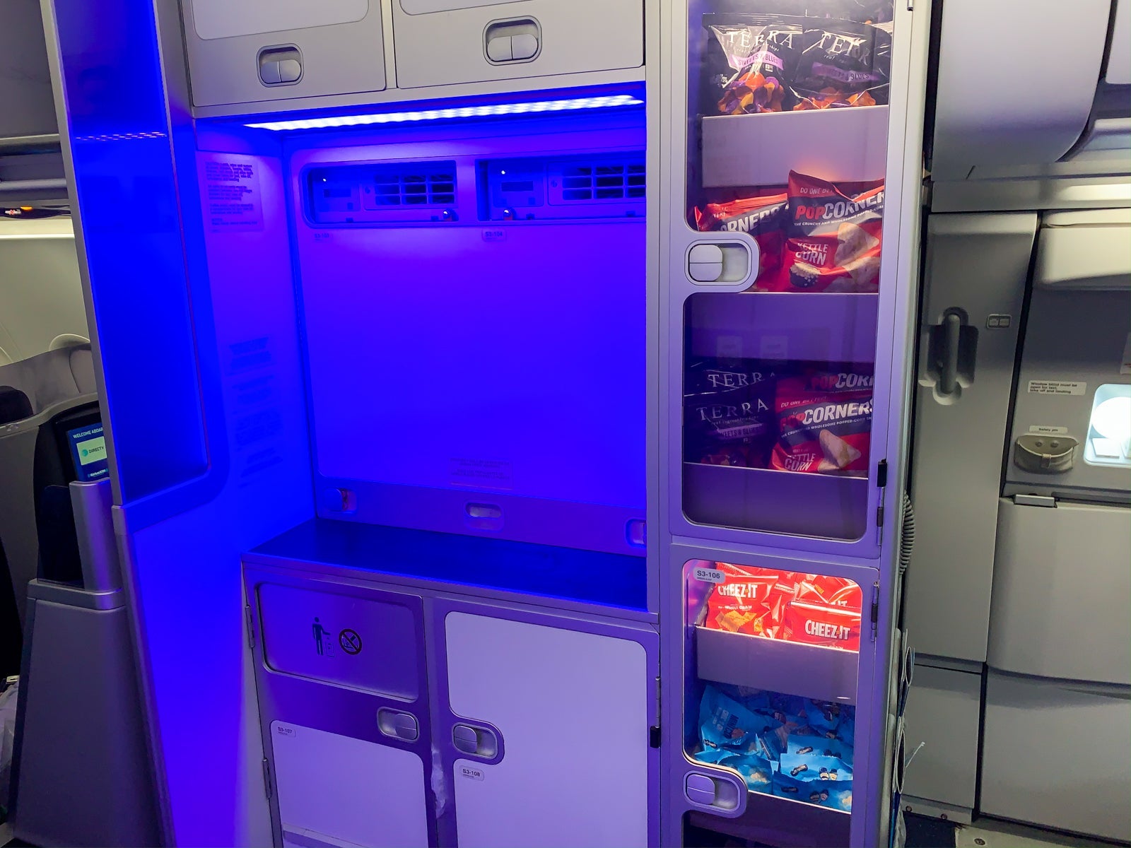 There was even dedicated shoe storage underneath this counter. Still, I wished there were more-enclosed storage, as my loose items easily moved around during turbulence.