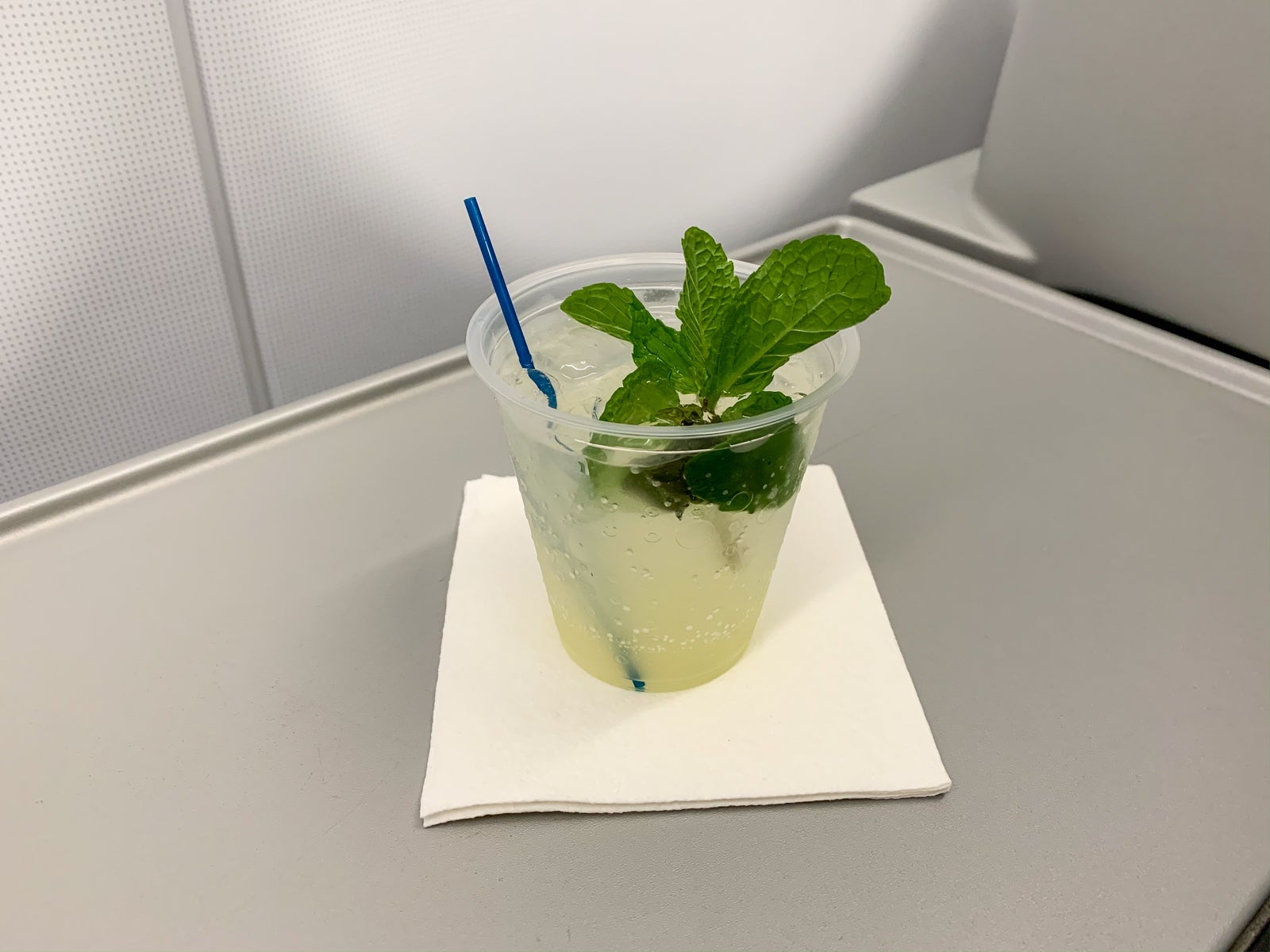 Although the entire plane boarded through Door 1L, the two dedicated Mint flight attendants gracefully introduced themselves to each passenger and offered predeparture beverages of choice. I chose the signature honey-infused limeade, which was a refreshing cocktail of vodka, lime, mint and club soda.