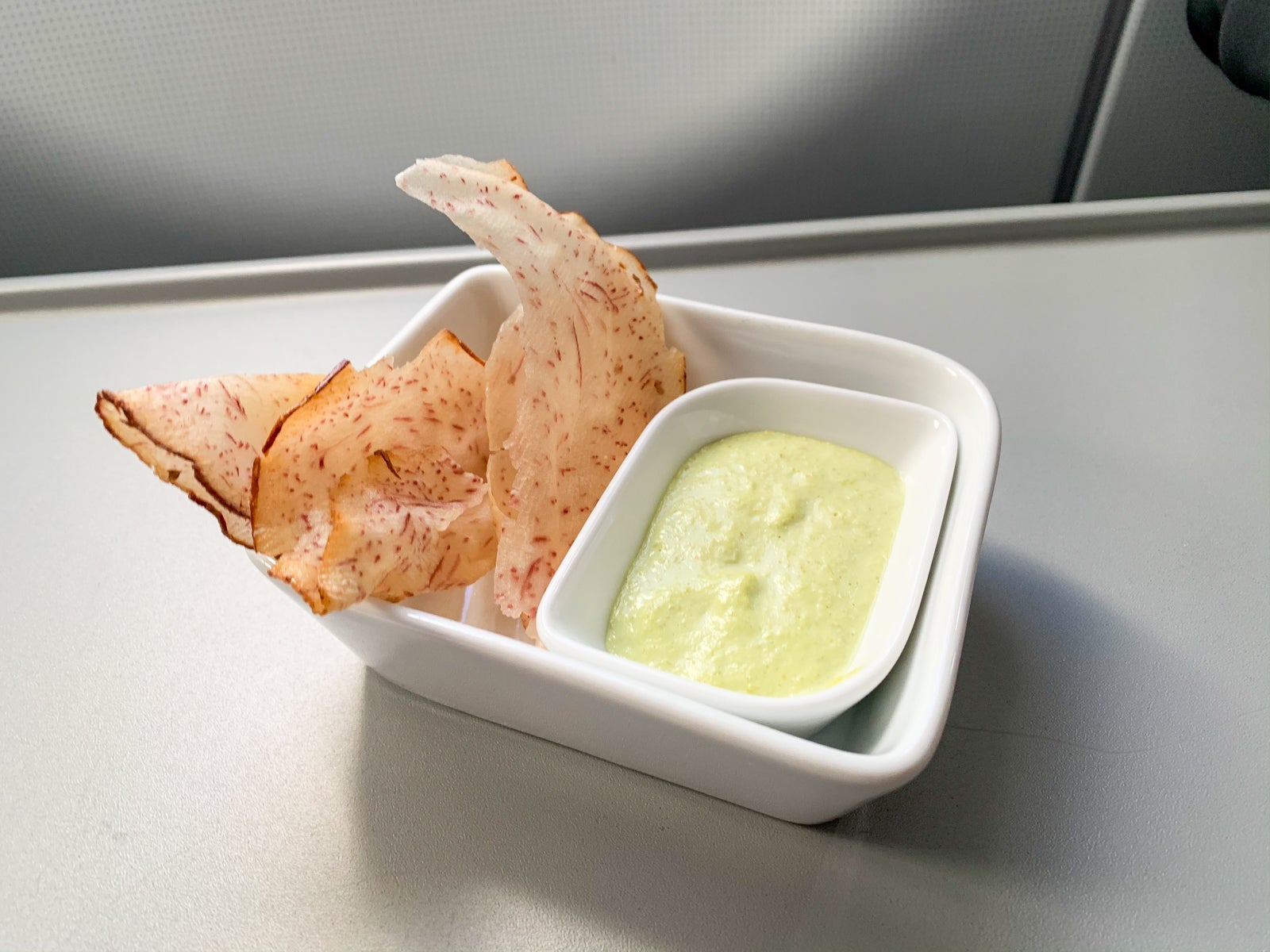 On my flight, all passengers were offered the same welcome taste of green aioli with taro chips. I found this a nice way to begin my meal (and a welcome departure from the mixed nuts I'm used to getting on the Big 3.)