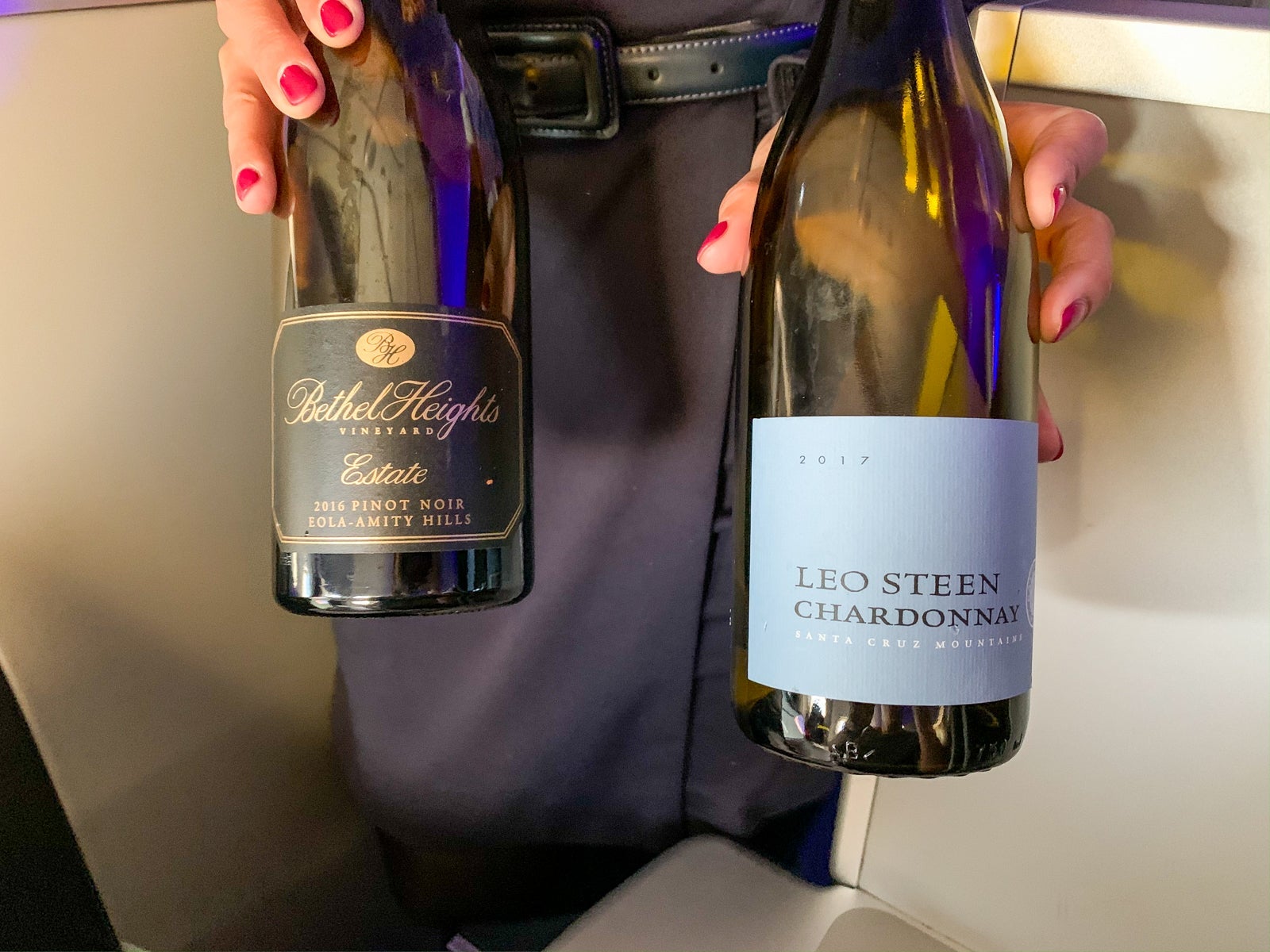 The sparkling wine on offer was Roederer Estate brut, while the chardonnay was Leo Steen 2018 and the pinot noir was Bethel Heights Estate 2016.