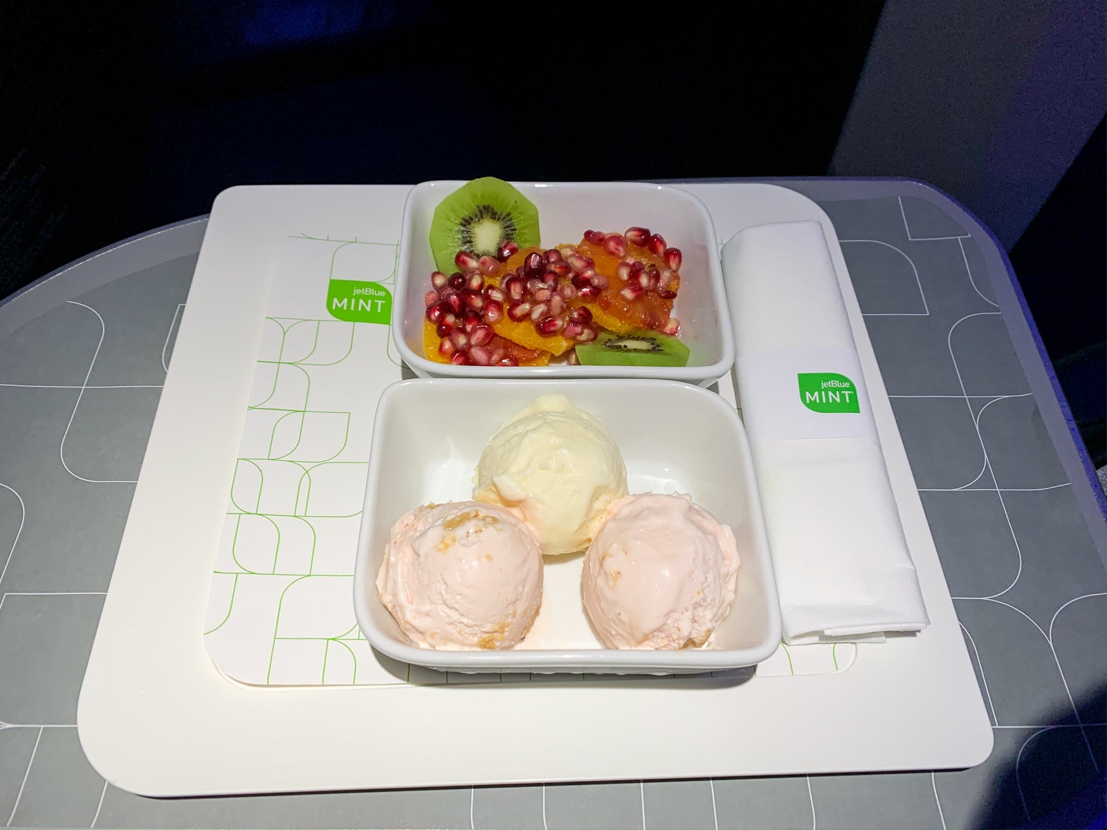For dessert, there was a choice of fresh fruit or Blue Marble ice cream. Naturally, I chose both. On most airlines, fresh fruit plates consist of an assortment of melons and oranges. On JetBlue, I was served kiwi, oranges and pomegranate seeds. My taste buds really liked the unique assortment.