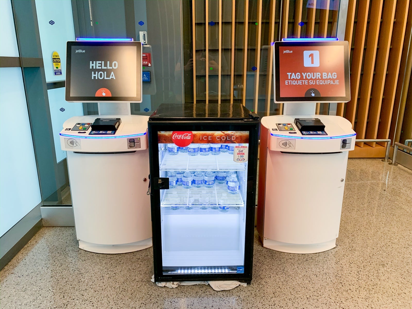 There wasn't much of a line, and we were checked in within minutes. The agent was friendly and confirmed my girlfriend's special meal request. Before heading to security, I noticed that there was a small Coca-Cola fridge (TBT to the days when JetBlue served Coke). Sadly, the fridge wasn't filled with Coke but rather with small water bottles. Still, though, a nice gesture that I appreciated after a long car ride to JFK.