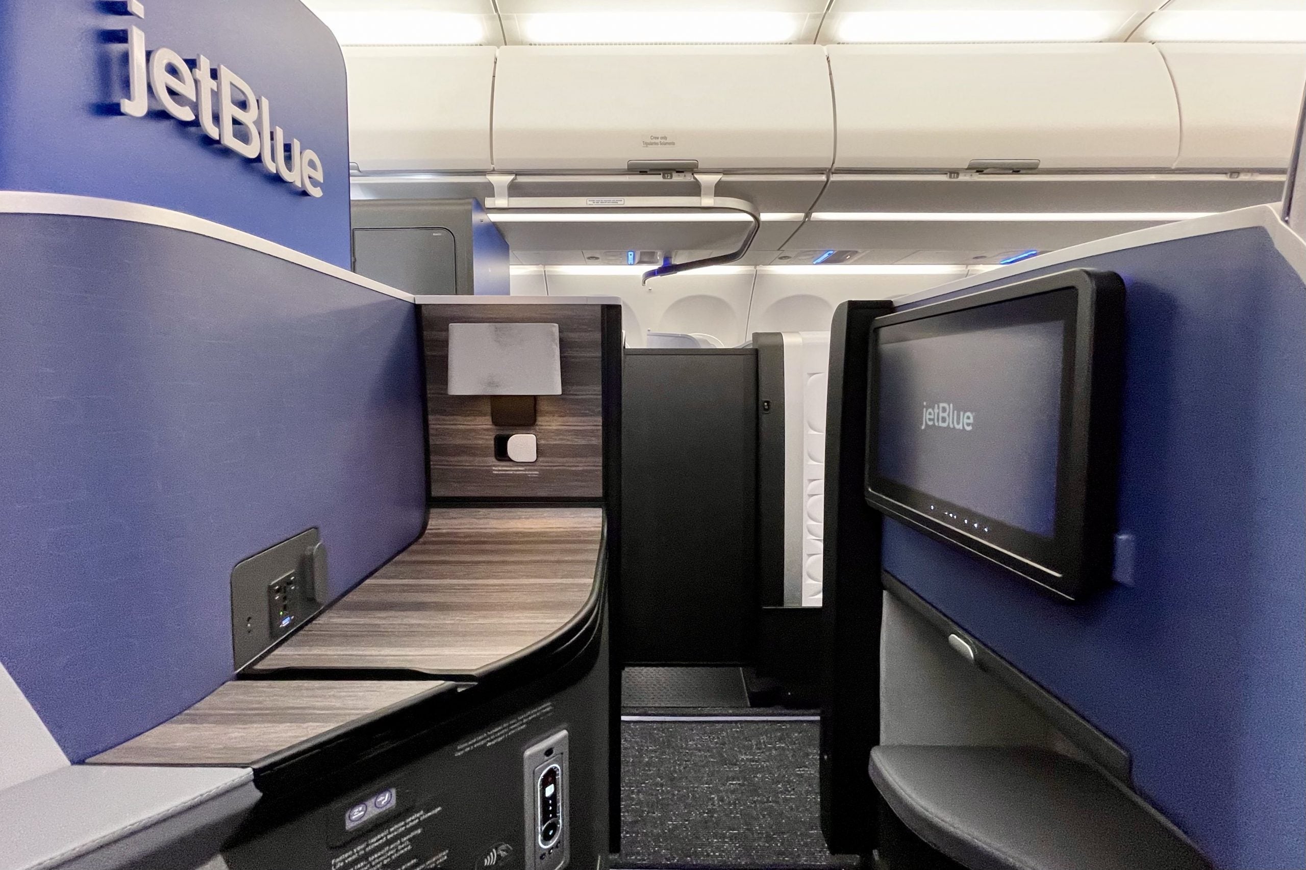 Just like on the A321neo, suites in the first row are branded as JetBlue Studios, with considerably more space to stretch out, a large 22-inch screen and a buddy seat for a friend to join you for a chat or chew.
