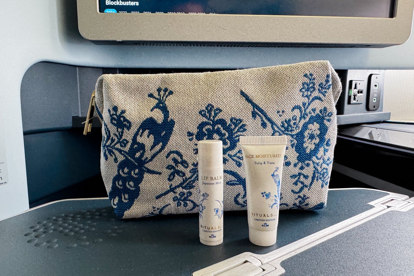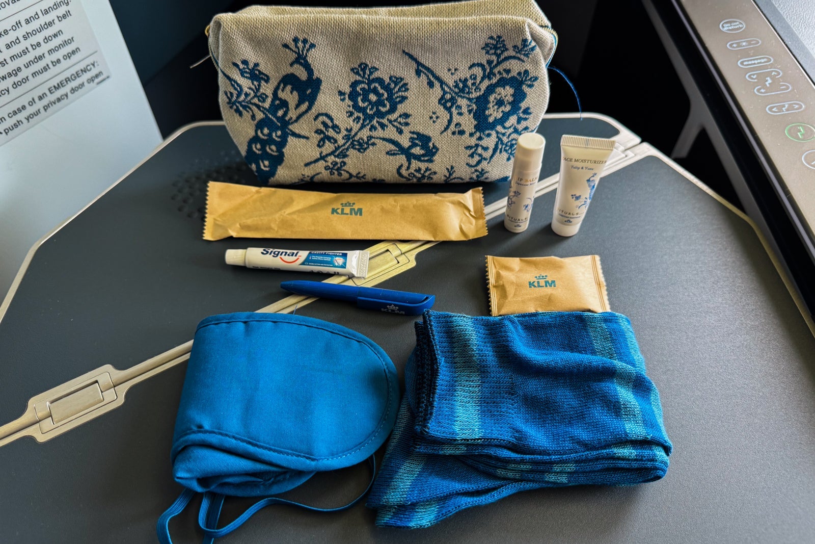 This contained a dental kit, ear plugs, a fabric eye mask, socks, a pen and Rituals skincare products, including lip balm and facial moisturizer with a light floral scent. KLM does not offer pajamas in business class.