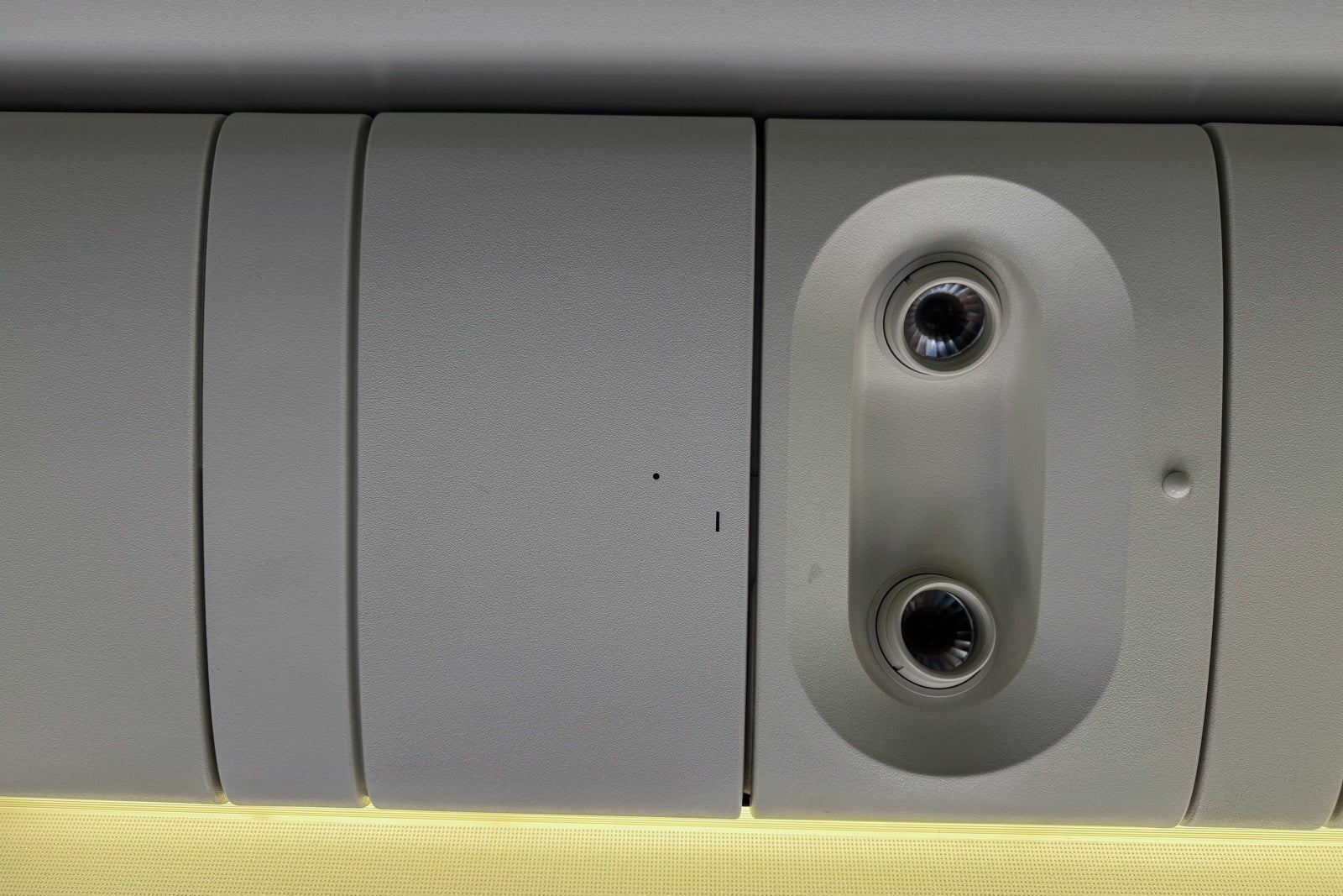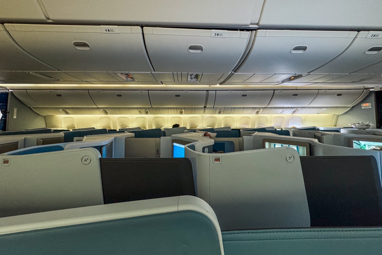 Overhead bins ran down both sides and the center of the cabin (the first few center rows don't have their own bins because they are under the crew rest area). That means there's plenty of storage for each passenger, but the cabin feels a little less spacious because of it.