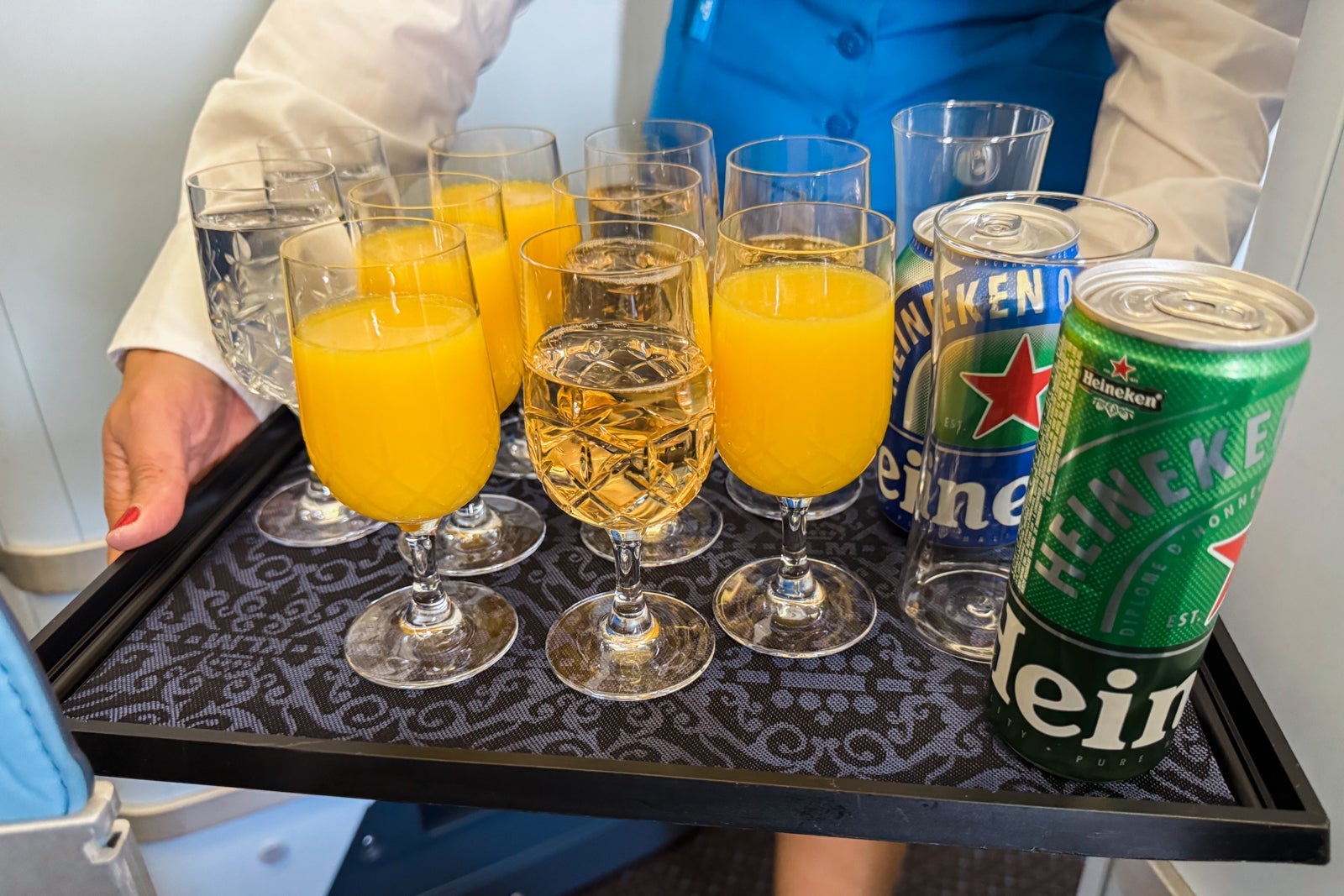 As I did so, flight attendants came through the cabin offering passengers a choice of water, orange juice, Champagne or Heineken as a predeparture beverage.