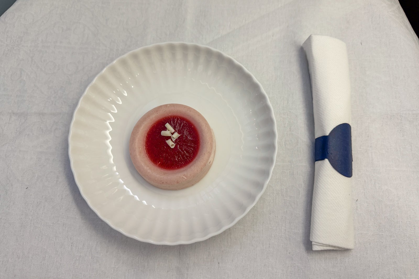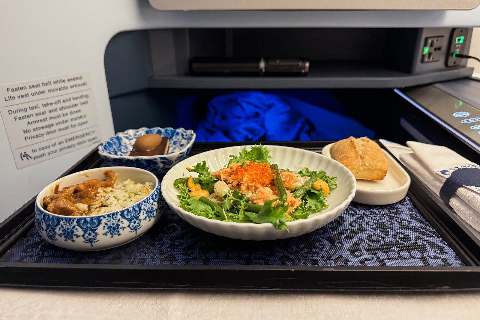 When I boarded, I found a large pillow and a plastic-wrapped cotton duvet waiting at my seat. There was also a cute fabric amenity kit with a pattern knitted on it that resembled a Delft tile with flowers and a peacock.