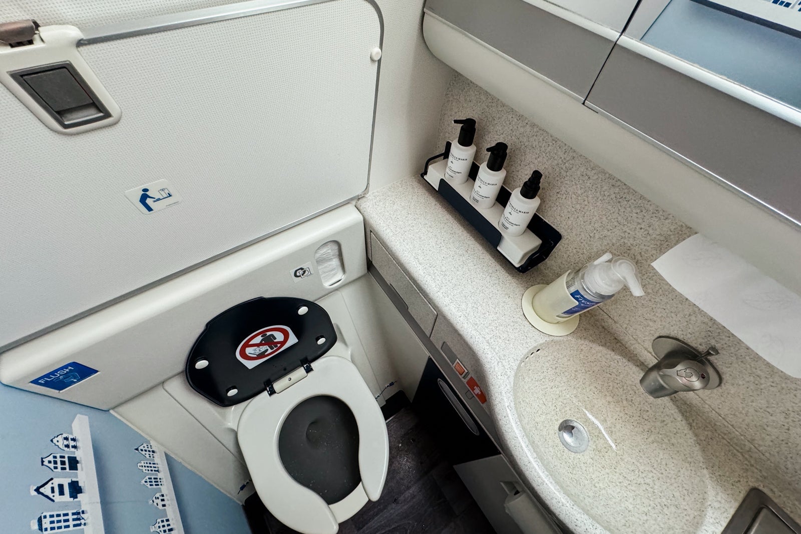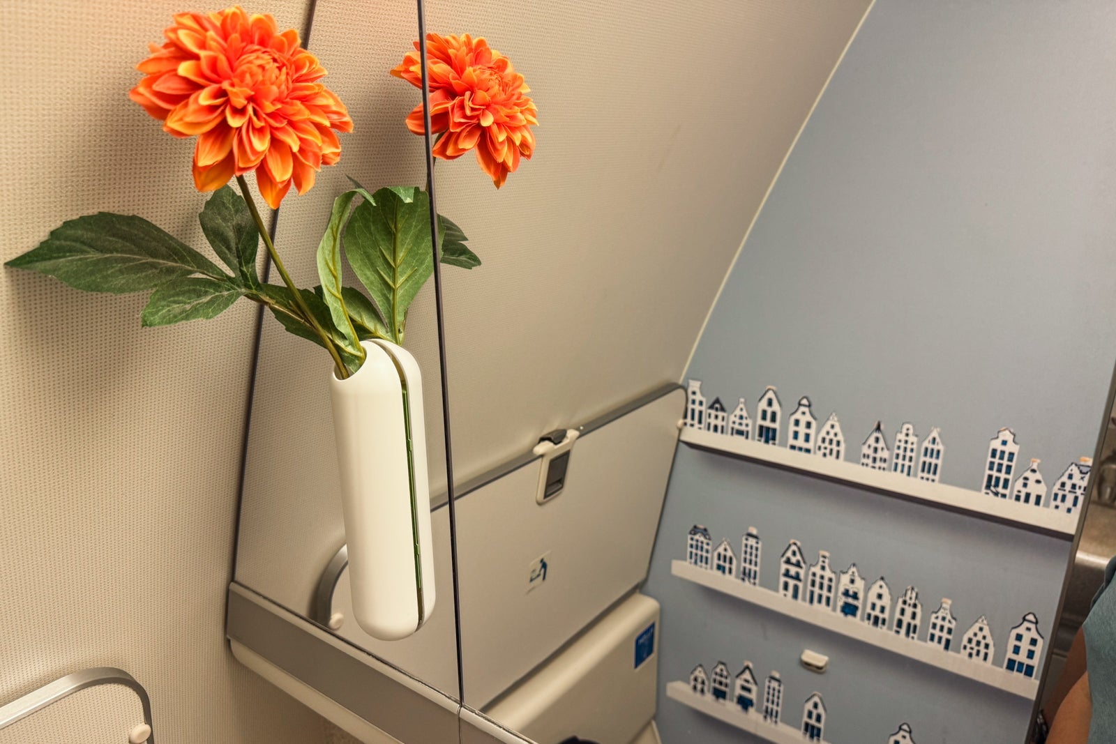 The airline also stocks the lavatories with large bottles of fragrant face mist, hand soap and sanitizer by Dutch brand Marie-Stella-Maris, and a wall-mounted vase with a colorful artificial flower.