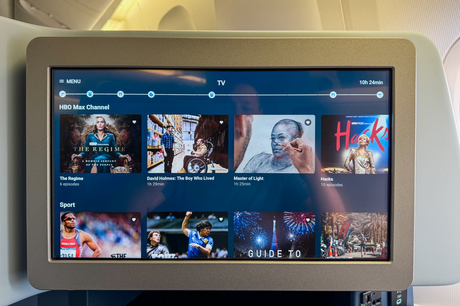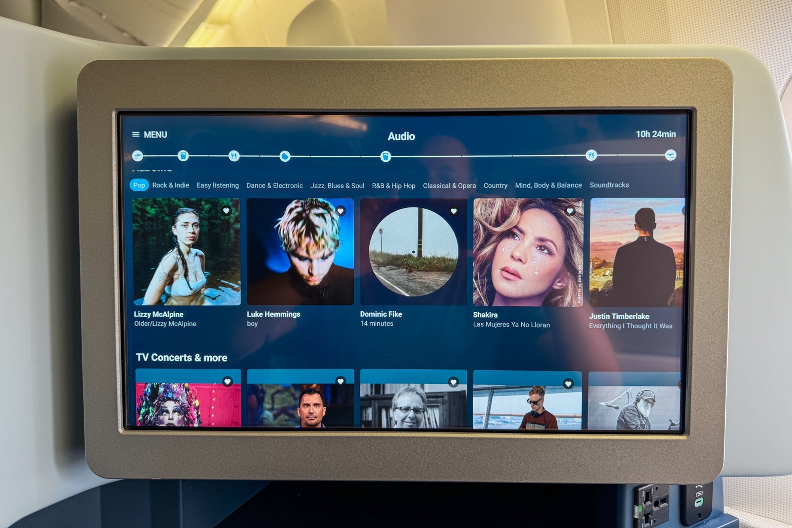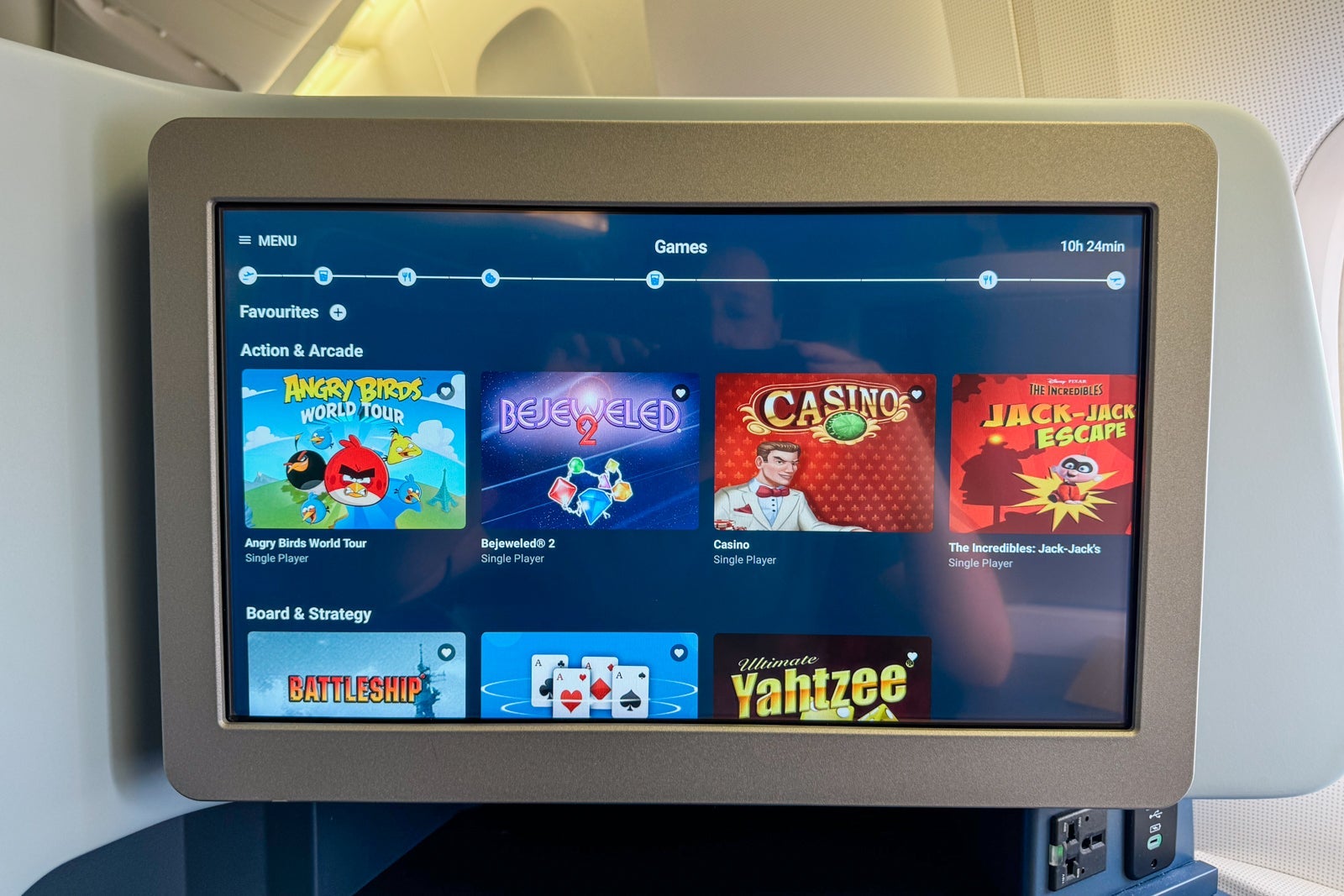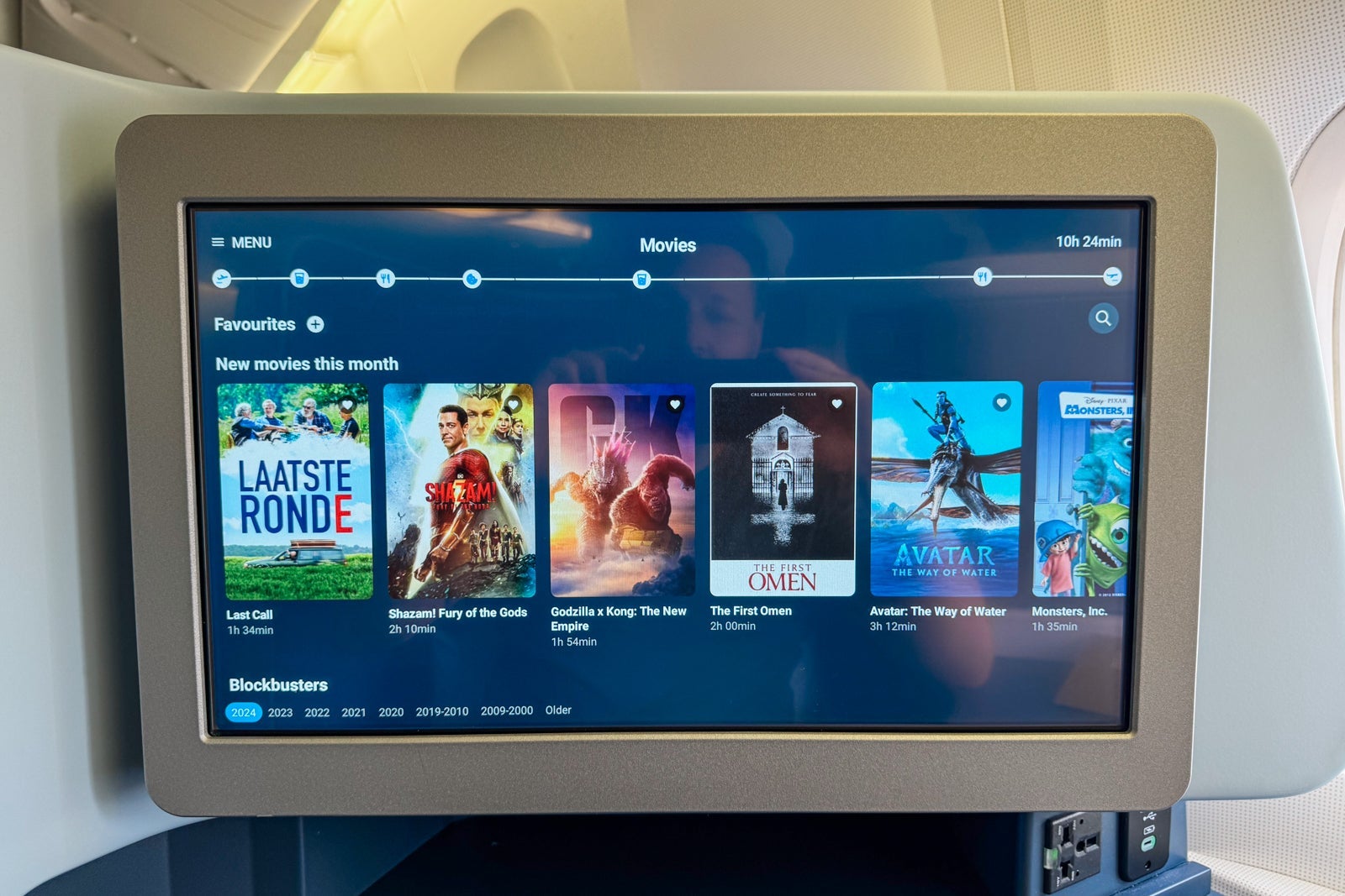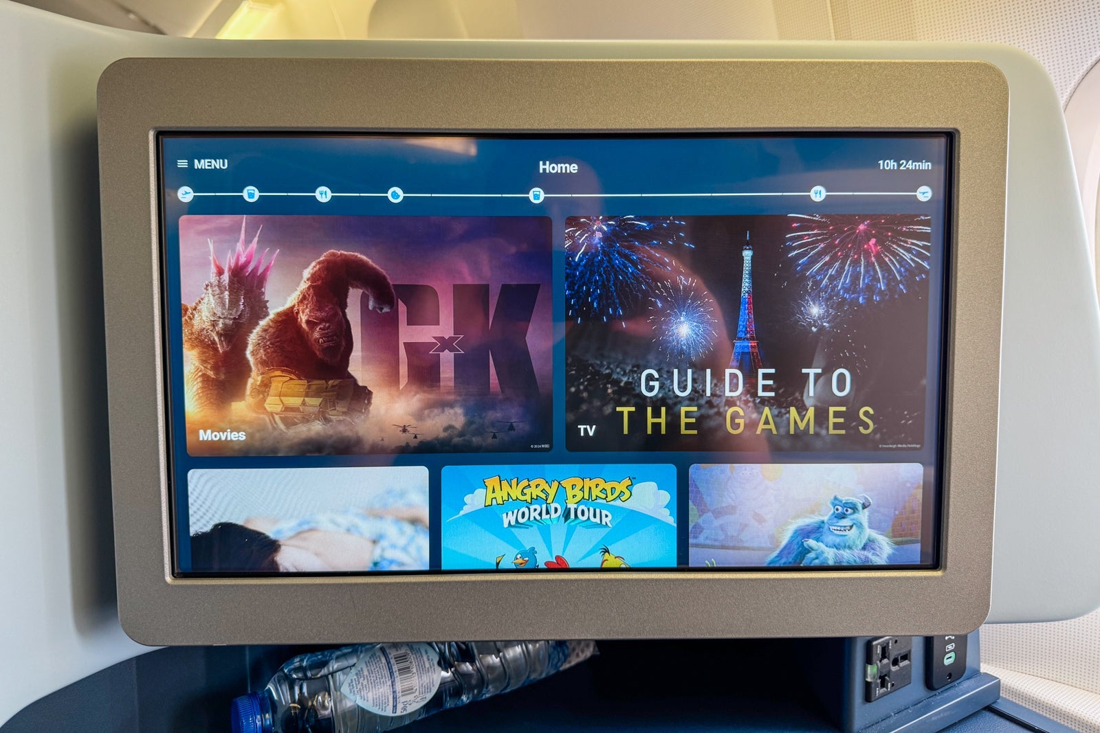 The seatback monitor was 18.5 inches wide and featured an extensive library, including hundreds of movies from around the world, television shows, musical albums and games. I wouldn't count on the newest releases in terms of movies or TV, but the selection was large and mostly up-to-date.