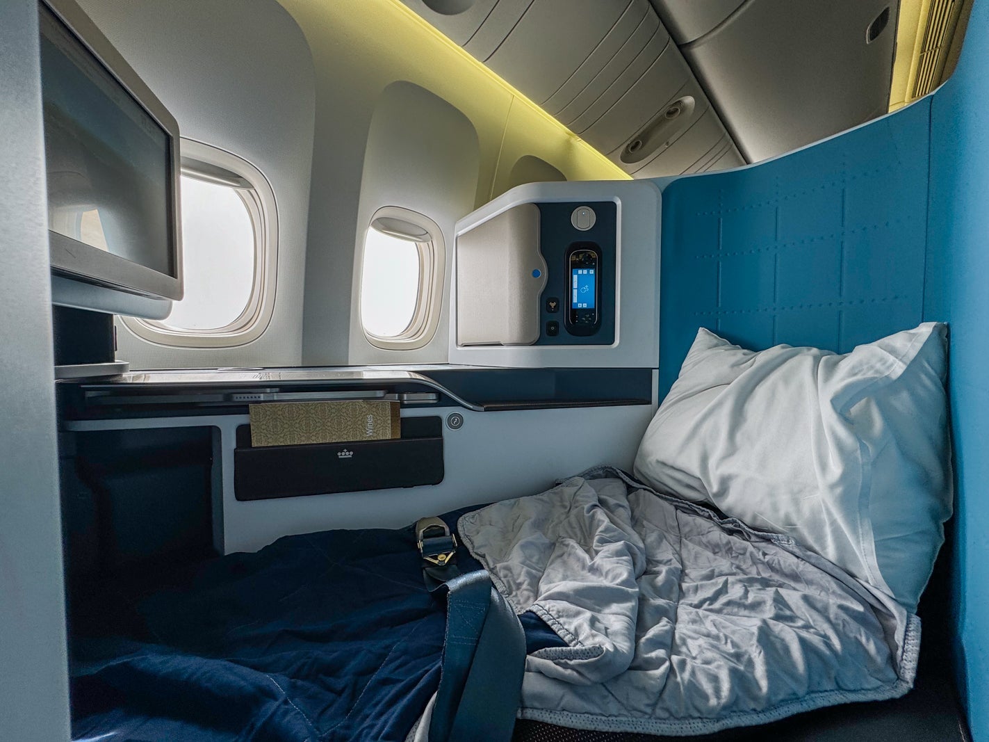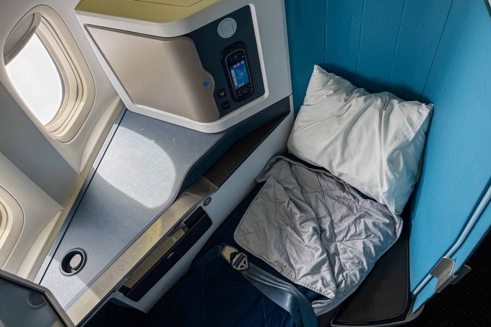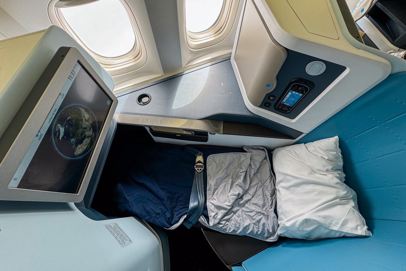 It was easy enough to recline my seat to fully lie-flat mode, and in that position, it measured 78 inches long. The airline provides a light duvet and a large pillow but no seat cover or other bedding. You'll be responsible for making up your own bed when the time comes. That said, I found the seat's padding to be comfortable, and for a simple setup, it was still cozy enough for a long snooze on my daytime flight.