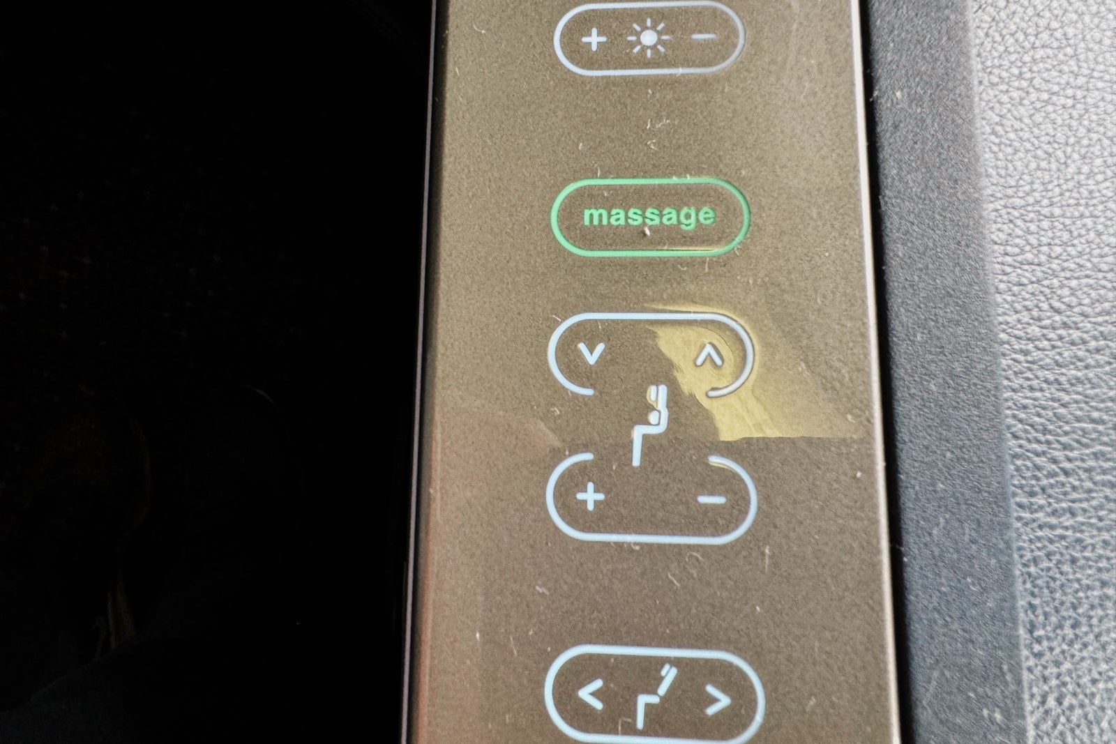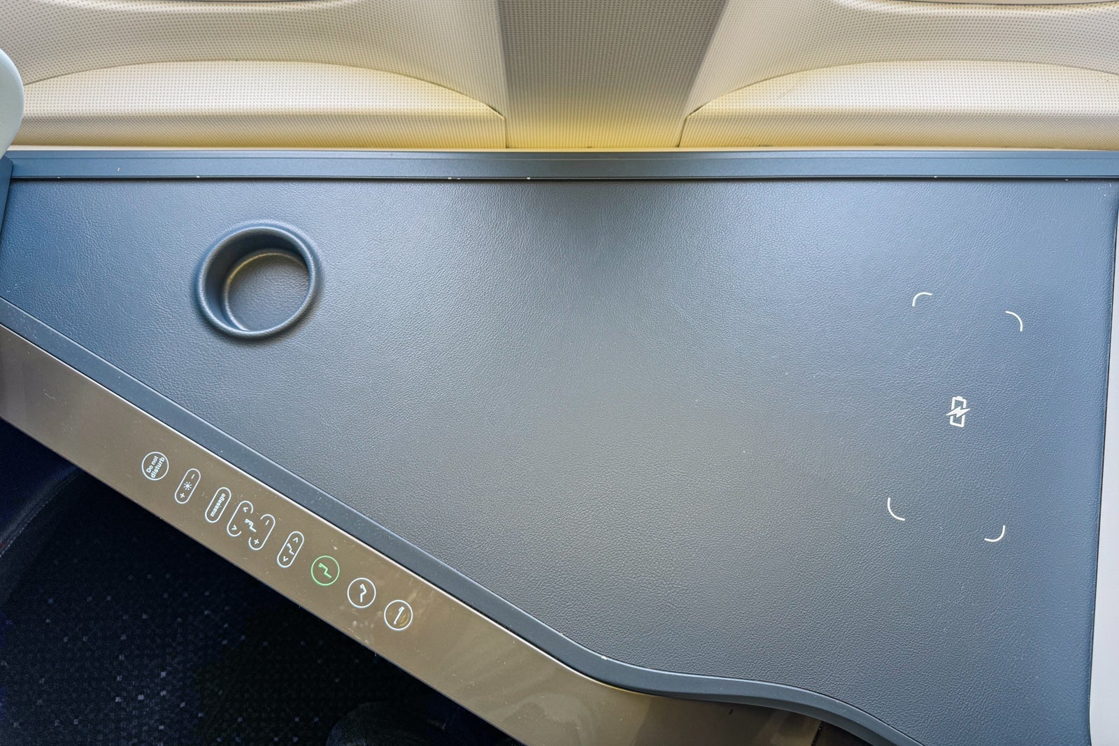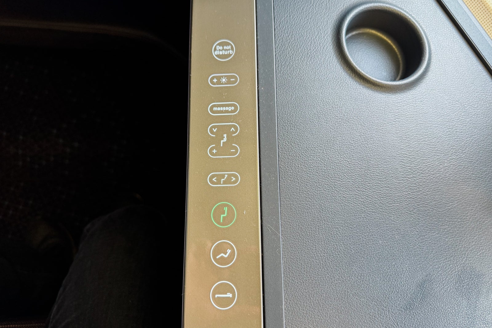There is a 3-inch-wide armrest running alongside the console with controls for three preset seat positions — upright for takeoff and landing, a lounge mode and fully flat. There's also a control for the seatback position, one for the brightness of the seat's lighting, a gentle massage function and buttons for lumbar and head support positioning.