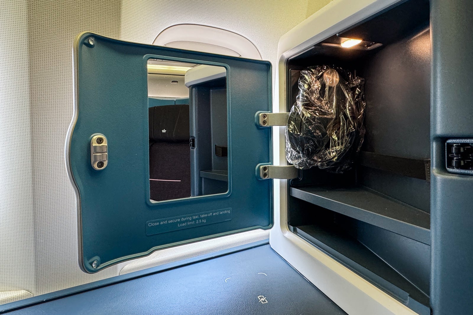 There is a small cabinet above the large console with a door that pops open to reveal a vanity mirror and a cubby with a strap. You can put your amenity kit in there, plus there's a hook for the (decent) noise-canceling headphones. This is a nice update from the 787-10 seats, which have an exposed recess rather than a closed cubby.