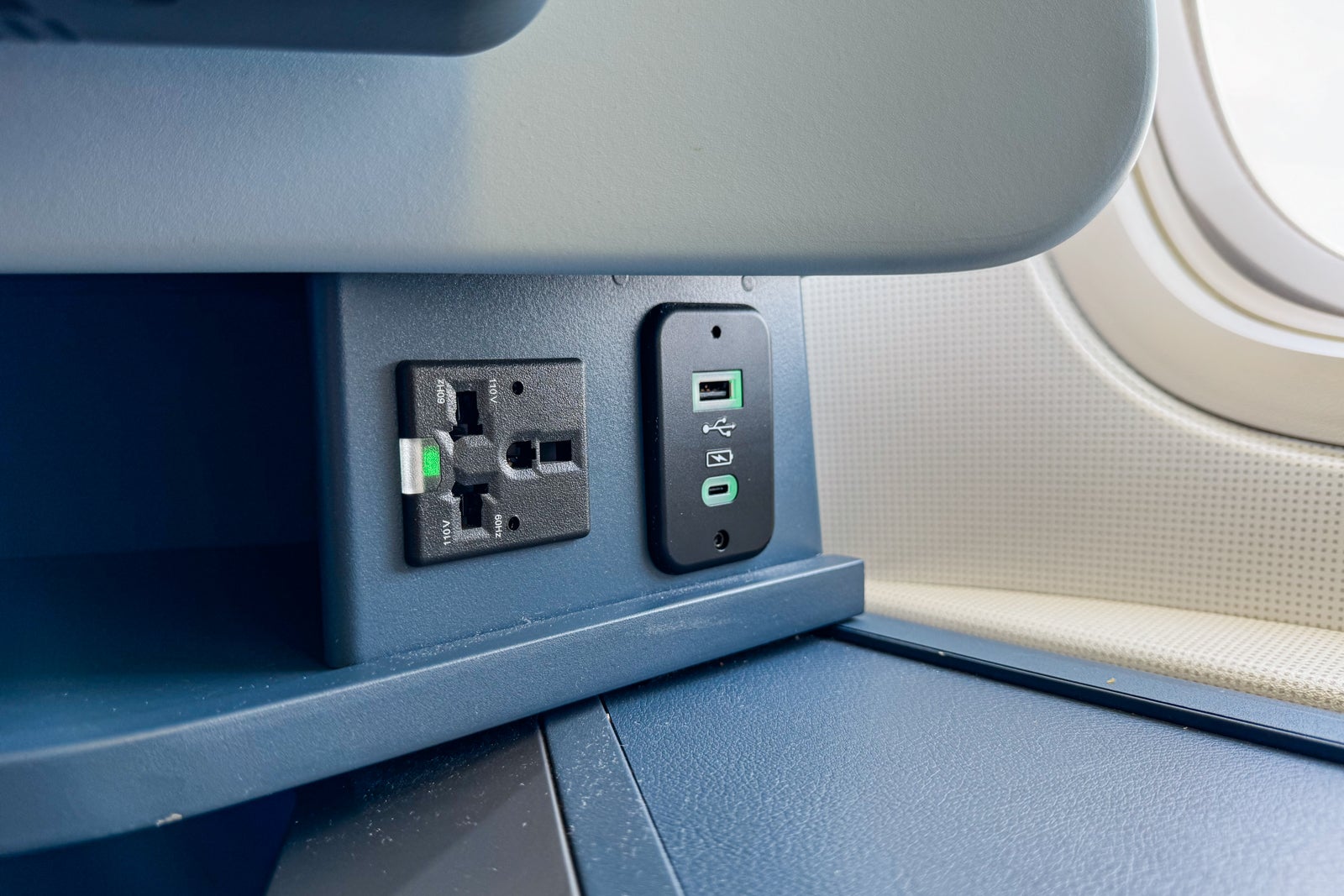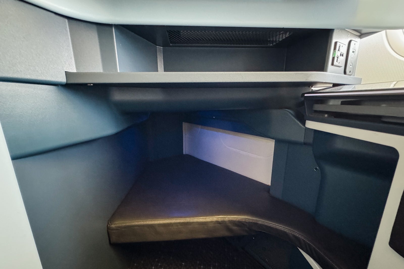 Opposite the seatback and beneath the entertainment screen, there is a narrow shelf measuring 15 inches wide by 7 inches deep; it's tall enough to hold a water bottle on its side. Next to that is a universal power plug and both USB-A and USB-C ports.