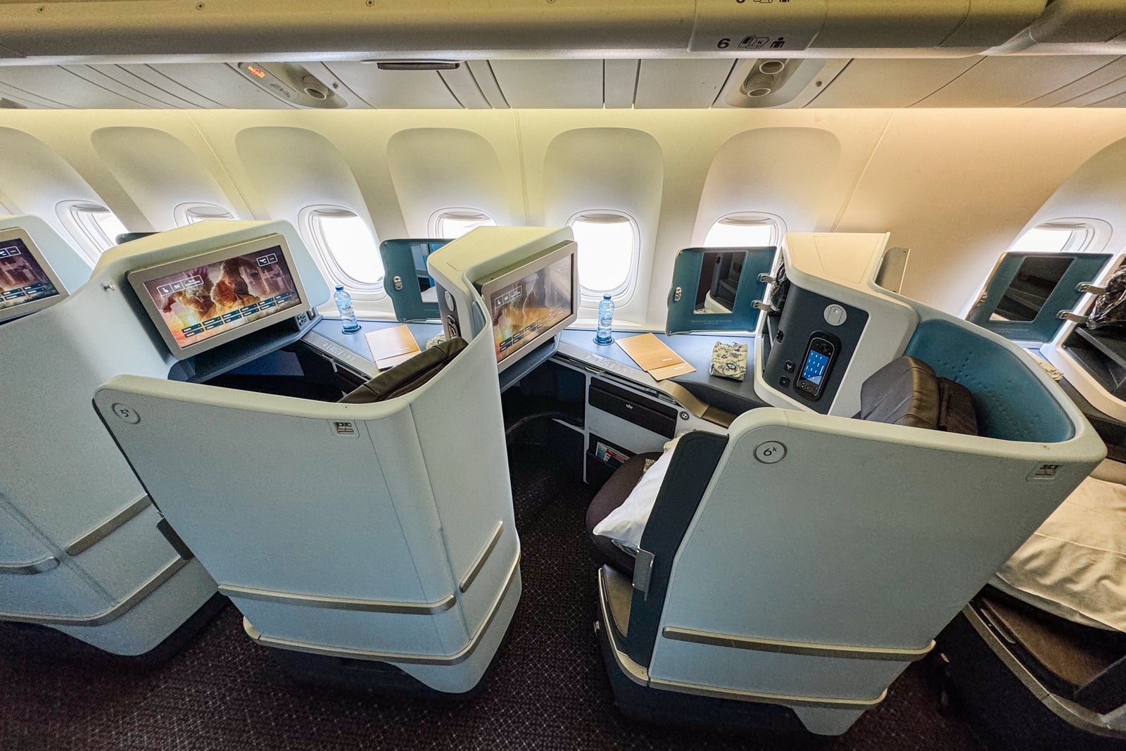 The seats running down the middle of the cabin are angled toward one another, while those on the sides angle out toward the windows. All have direct aisle access. If you're traveling with a companion, the center seats are best; solo travelers might prefer the side seats.