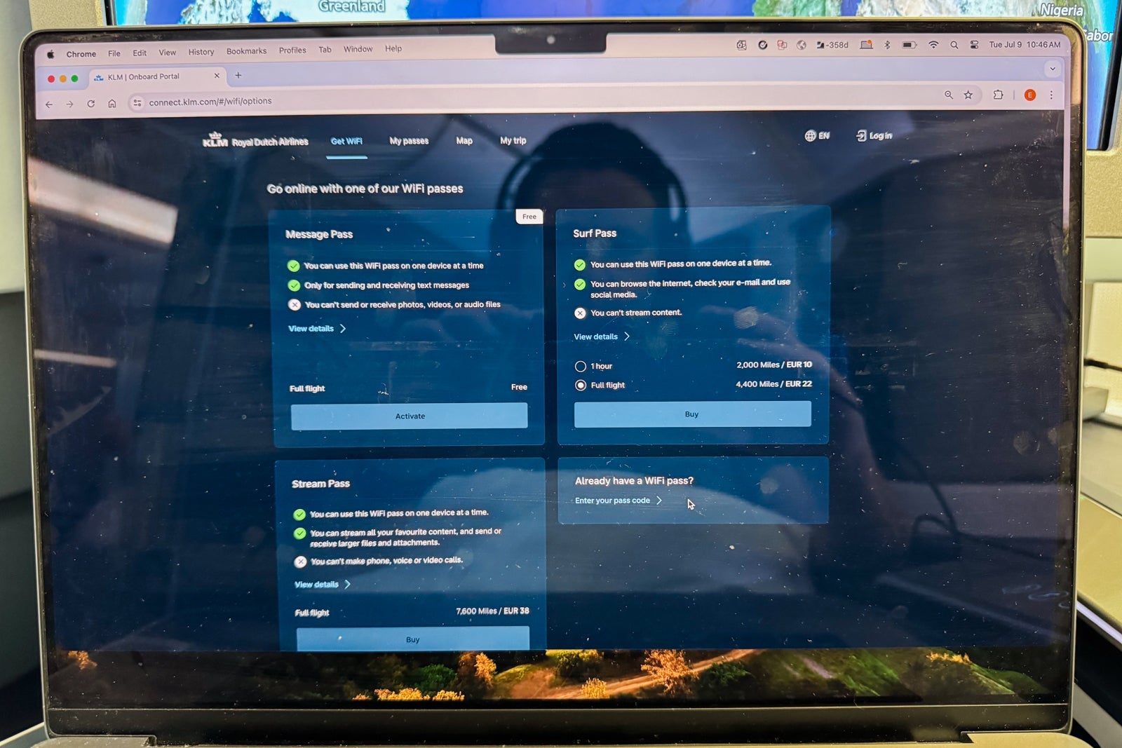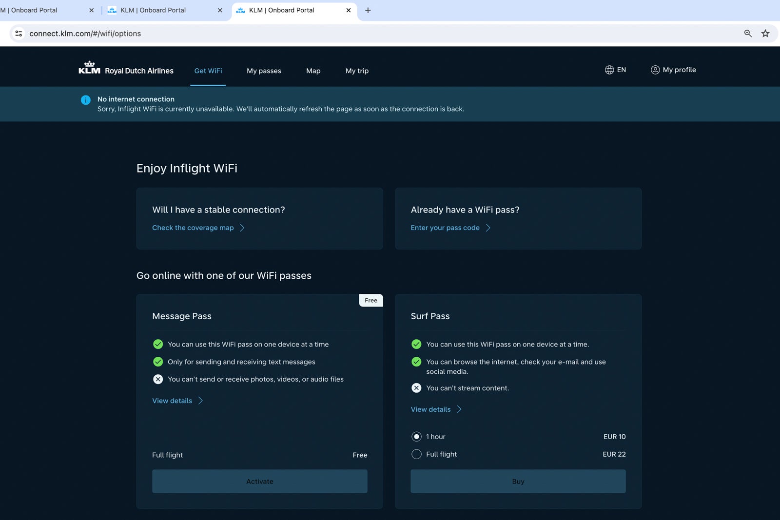 There was also a one-hour surf pass for 10 euros ($11) and a full-flight one for 22 euros ($24). I purchased the latter and was able to send email and surf the web for an hour here or there. However, I would not buy a pass again, given how much trouble the system seemed to be having.