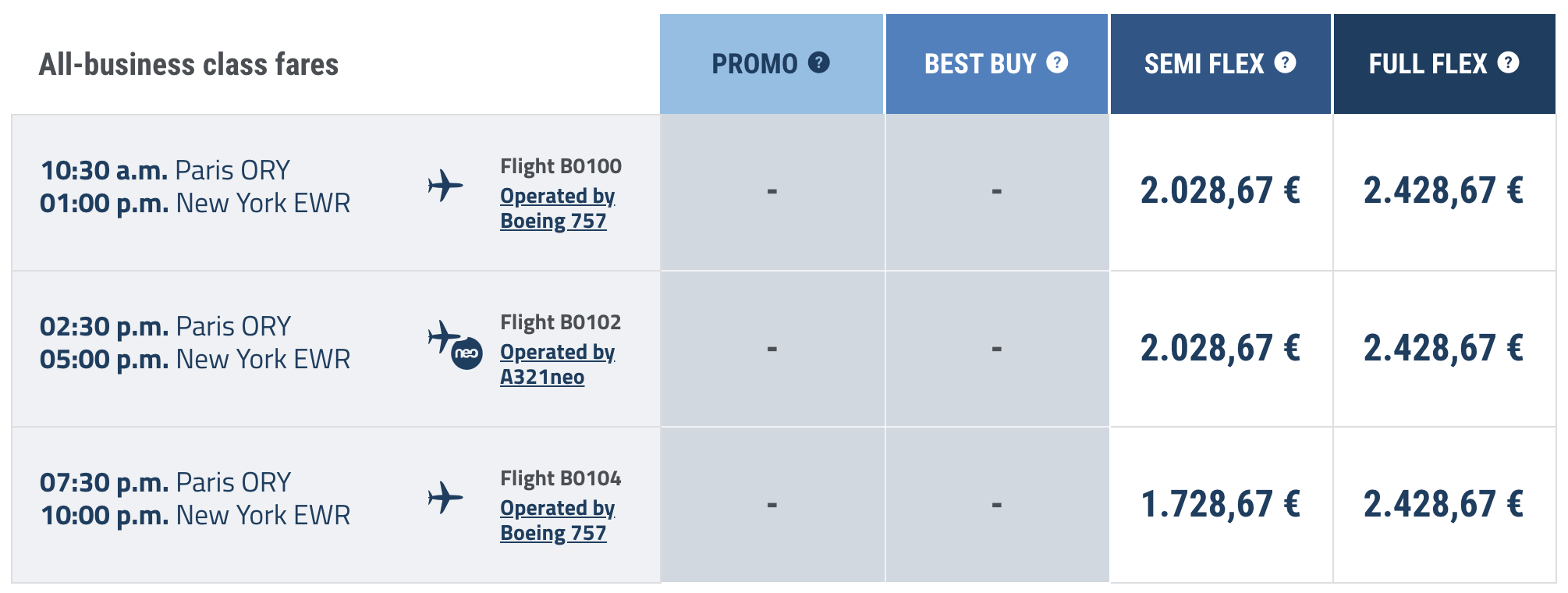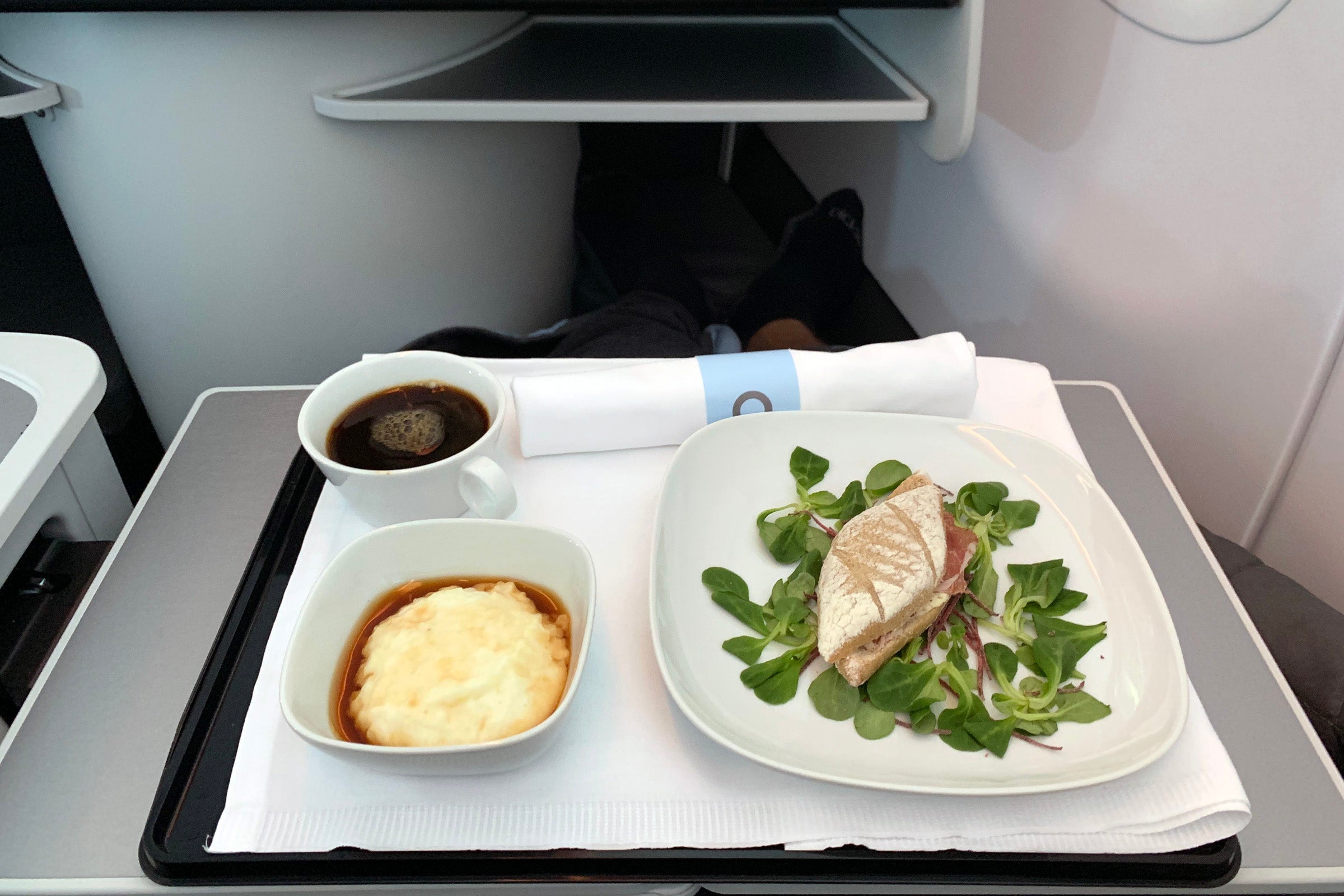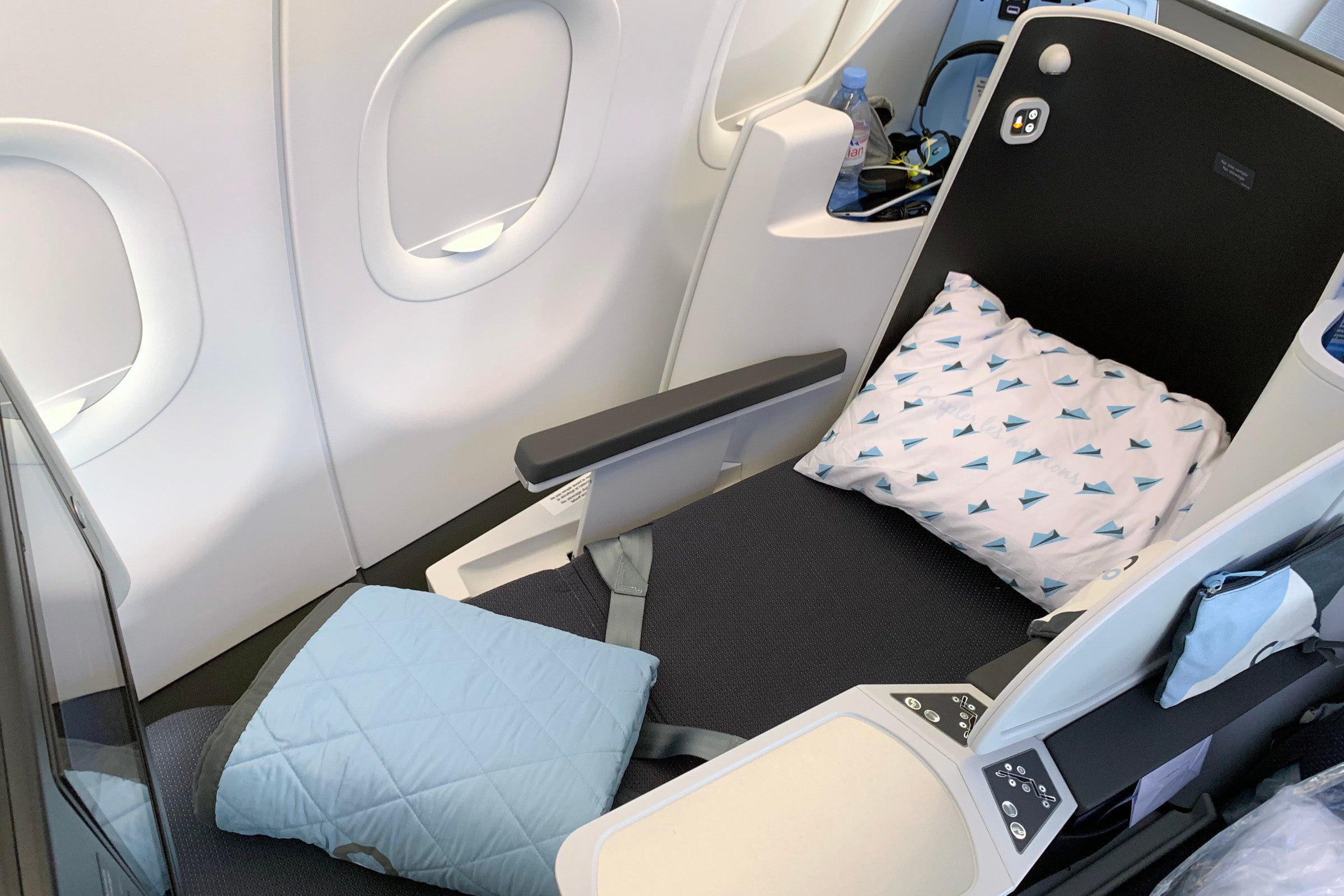[tpg_rating tpg-rating-score="74" ground-experience="7" cabin-seat="22" amens-ife="12" food-bev="16" service="17" pros="All-business lie-flat cabin, incredibly fast (and free!) Wi-Fi, decent catering, frequent fare sales." cons="Bus gate at Orly, no direct aisle access from window seats, IFE display is too reflective to see in a bright cabin, aircraft swaps are possible, entirely inflexible call center agents." /]