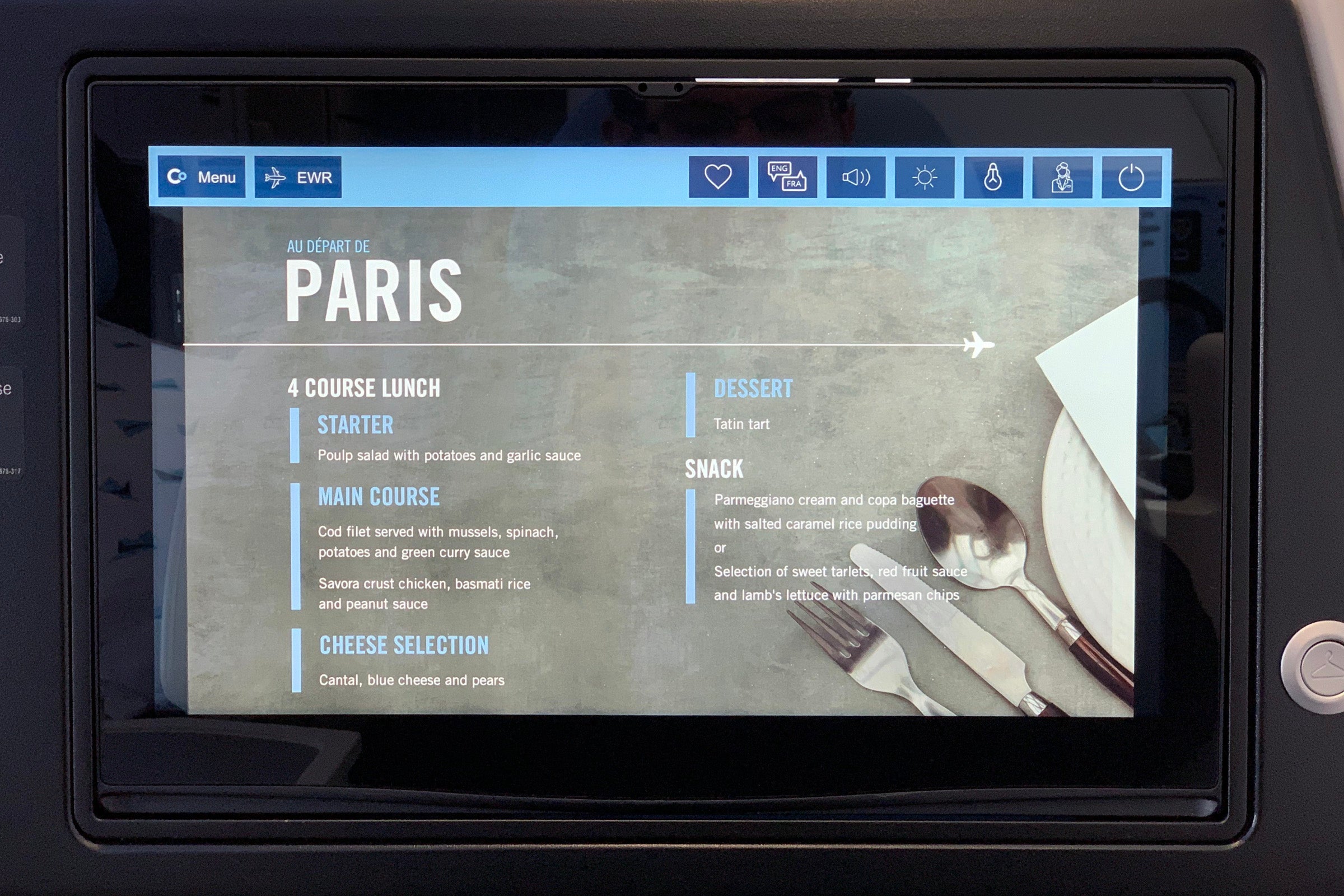 I was going to ask about the menu but then I noticed a "My Meals" option on the inflight entertainment system. And there it was, along with menus for Newark-Paris and La Compagnie's flights to and from Nice (NCE).