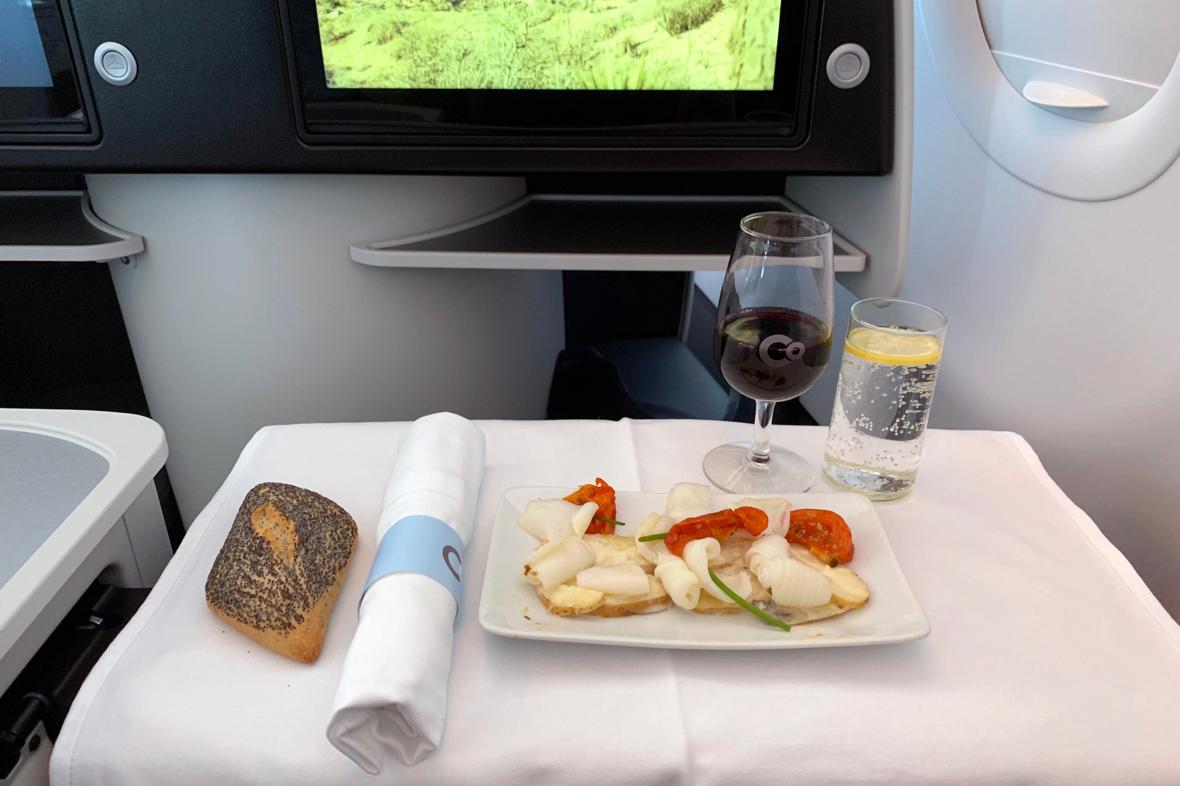 The appetizer didn't appear until nearly 45 minutes after that — an hour and 15 minutes after takeoff. I didn't mind much given that we had a long daytime flight ahead, but that was a fair amount of time, considering how few passengers were on board. I'm not a huge fan of squid, but the potatoes and tomatoes tasted just fine. The bread was cold and stale, though, and served without butter or olive oil.