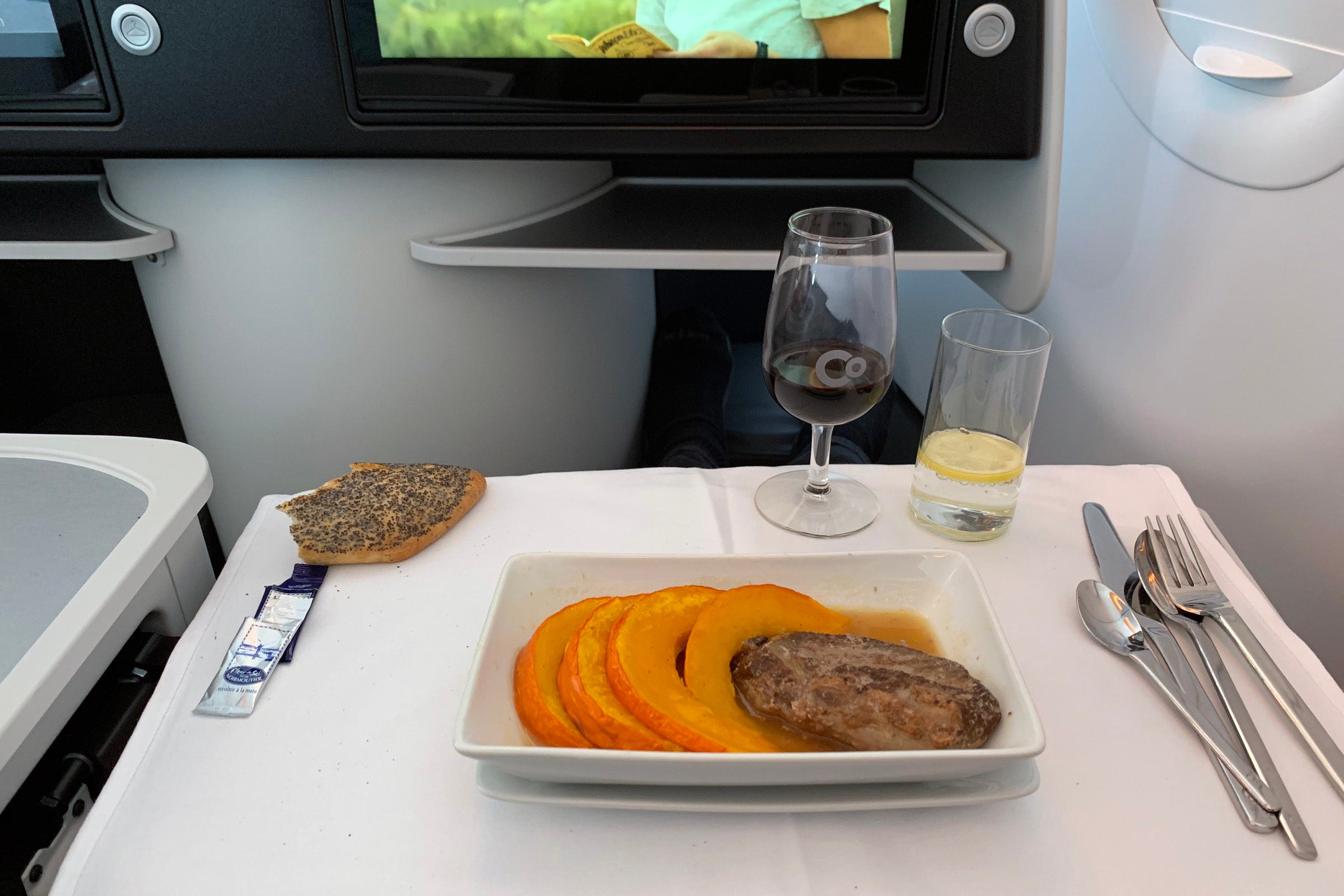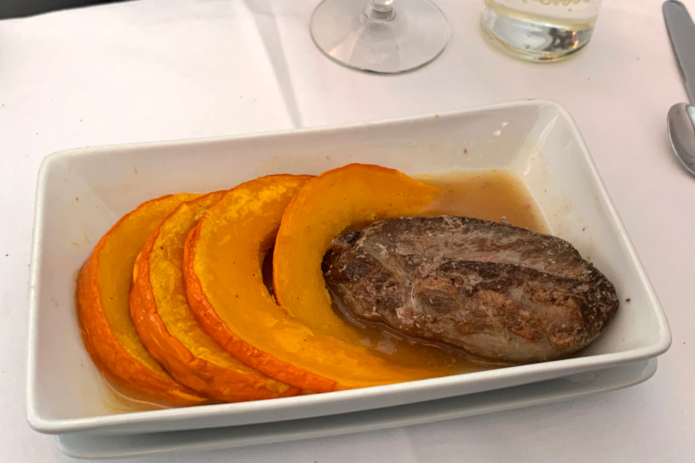 The flight attendant came by with entrees more than an hour and a half after takeoff, but the selection didn't match the on-screen menu. The options included a duck breast or "fish." Since I was the very last passenger to be served, I asked if I could try both. The flight attendant seemed to get very uncomfortable after I made that request, and said she'd have to check to see if there were enough — I could only have one right now.