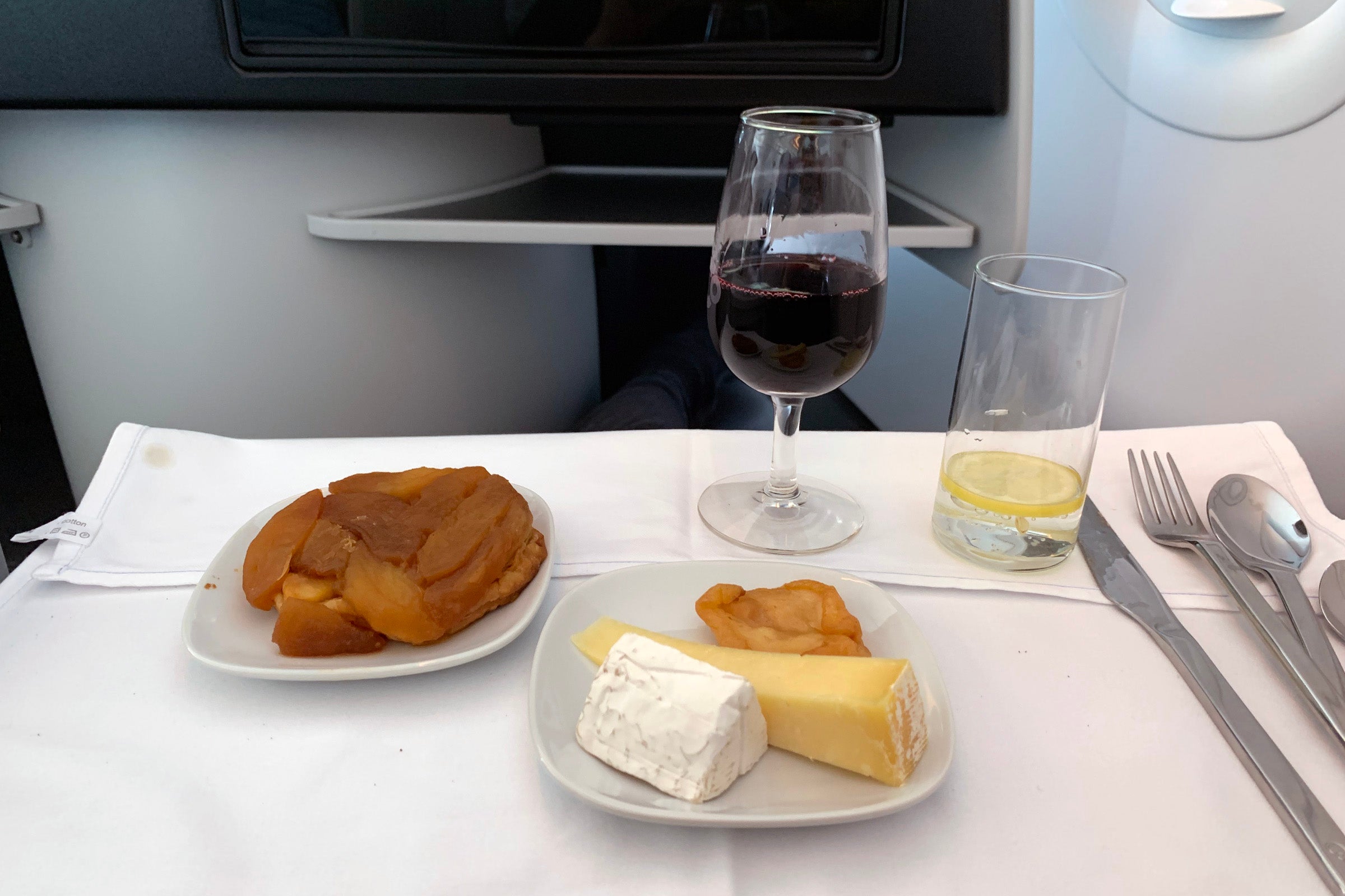 I did get a drink refill with dessert, though, which consisted of an apple tart and mixed cheese and arrived two hours after takeoff. Neither was exceptional, but I ate a few bites.
