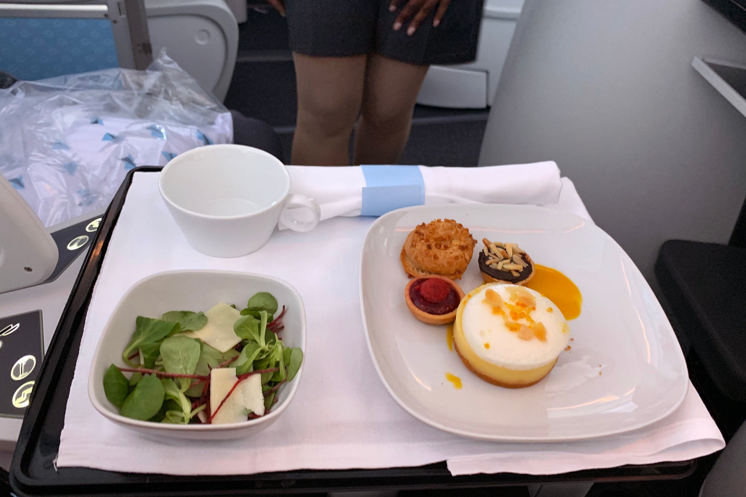 The other option was a dessert plate with a side salad. I asked to snap a pic — the sweets were tempting but felt a decadent for what's normally a savory prearrival meal.