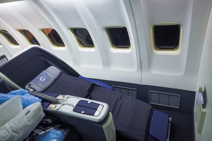 With 62 inches of pitch, the seat transforms into a thinly padded, angled bed that will never be thought of as industry-leading — but at these prices, I'm okay with that.